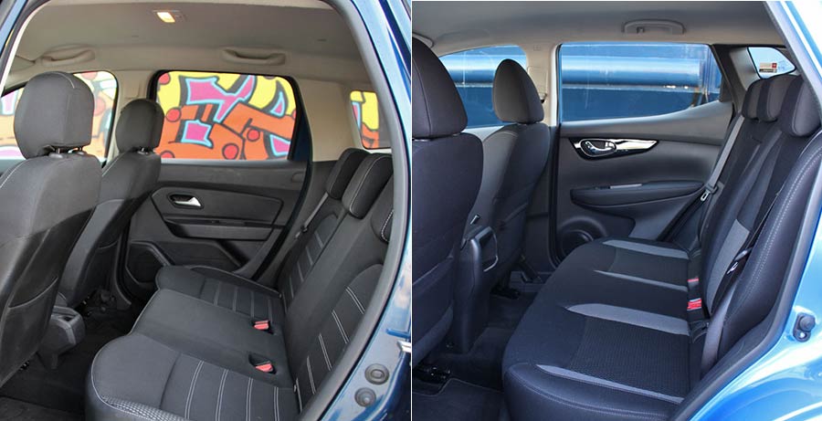 Στο σημείο όμως που το Duster δεν θα αφήνει κανέναν με παράπονο, είναι σε χώρους, αφού θα φιλοξενήσει πολύ άνετα τέσσερις ή και με κάποιες παραχωρήσεις πέντε επιβάτες με τις αποσκευές τους (411 λτ. το πορτ μπαγκάζ). Καμία παραχώρηση δεν θα γίνει και στην καμπίνα του Qashqai, με το λίγο μεγαλύτερο χώρο αποσκευών των 430 λτ.