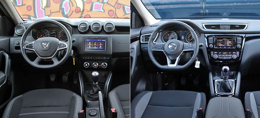 Ο θάλαμος των επιβατών του Qashqai κερδίζει αμέσως τις εντυπώσεις, με το που θα ανοίξει κανείς την πόρτα και θα κάτσει στη θέση του οδηγού. Η ποιότητα κατασκευής και η συνολική εικόνα που εισπράττεται είναι με εμφανέστατη διαφορά καλύτερη από του Duster, σε κάθε σημείο. Παχιά μαλακά υλικά συναντώνται σε ολόκληρο το ταμπλό μέχρι τα χαμηλά του τμήματα, καθώς και στο πάνω μέρος των θυρών. Προσεγμένο είναι το φινίρισμα και η συναρμογή, ενώ τα καθίσματα είναι αναπαυτικά και ο οδηγός θα βγει εύκολα την κατάλληλη θέση. Πιο σύγχρονο με τη σειρά του είναι και το σύστημα infotainment NissanConnect με την οθόνη αφής 7 ιντσών, τα νέα γραφικά, τη δυνατότητα φωνητικών εντολών και περισσότερες επιλογές εξατομίκευσης.
