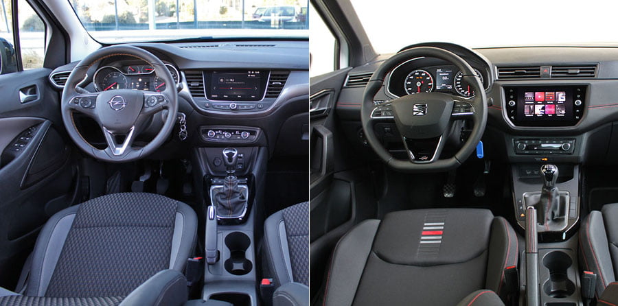 Οι καμπίνες και των δυο μικρών SUV είναι σύγχρονες σχεδιαστικά, ενσωματώνοντας όλες τις απαραίτητες ανέσεις κι ευκολίες που περιμένει κανείς από ένα σύγχρονο αυτοκίνητο. Σε επίπεδο κατασκευής κανένα από τα δυο δεν θα σας απογοητεύσει, με τα υλικά που απαρτίζουν τις καμπίνες να είναι ποιοτικά. Στο Crossland X ολόκληρο το πάνω μέρος του ταμπλό αποτελείται από αφρώδες υλικό, έναντι σκληρού πλαστικού στο Arona, με την πιο στιβαρή όμως συναρμογή. Επίσης, στο Arona η επένδυση δέρματος στο διακοσμητικό του ταμπλό με τις κόκκινες ραφές και τα σπορ καθίσματα υπογραμμίζουν τον πιο δυναμικό χαρακτήρα της συγκεκριμένης έκδοσης. Κυρίαρχη θέση και στα δυο, έχει η οθόνη αφής των 7 ιντσών στο Opel και 6,5 ιντσών στο SEAT, που βρίσκεται στο ανώτερο σημείο της κεντρικής κονσόλας. Εργονομικά ζητήματα δεν θα συναντήσετε σε κανένα από τα δυο μοντέλα, ενώ και πρακτικά θα μείνετε ικανοποιημένοι, μιας και πλήθος θηκών υπάρχει σε αφθονία για τα καθημερινά μικροαντικείμενα.
