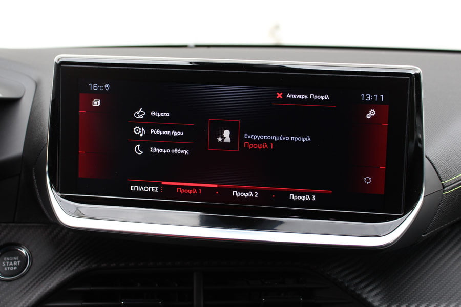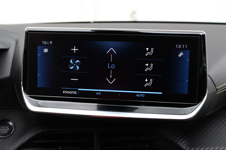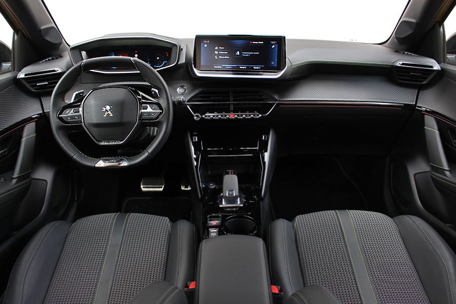 Το ίδιο μοτίβο συνεχίζεται εντός της καμπίνας. Το 208 δίνει στα μάτια συνεχώς ερεθίσματα με το τρισδιάστατο ψηφιακό καντράν 3D i-Cockpit των 10 ιντσών και το επίπεδο πάνω-κάτω, μικρής διαμέτρου τιμόνι. Επίσης, το ταμπλό χωρίζεται σε δυο επίπεδα, ενώ στο κέντρο του κυριαρχεί η πλατιά οθόνη αφής επίσης 10 ιντσών (7 ιντσών στην έκδοση Allure). Εκεί που ενδέχεται να μην ικανοποιήσει, είναι στην εργονομία, καθώς η ιδιαίτερη διάταξη τιμονιού και i-Cockpit δεν κάνουν ορατές τις ενδείξεις του πίνακα οργάνων σε όλους τους οδηγούς.