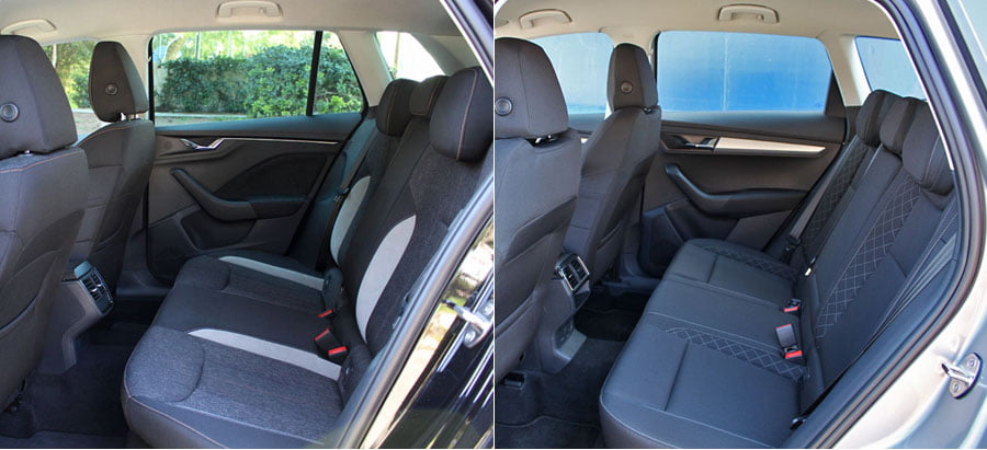 Στο εσωτερικό των δύο αυτοκινήτων δεν υπάρχουν σημαντικές διαφορές, τόσο σε ποιότητα, όσο και σε χώρους για τους επιβάτες. Το Karoq λόγω των μεγαλύτερων διαστάσεών του προσφέρει περισσότερο ωφέλιμο πλάτος στους ώμους και αέρα για το κεφάλι πίσω. Ο χώρος για τα γόνατα είναι ίδιος μεταξύ των δύο αυτοκινήτων (το Karoq έχει πιο κοντό μεταξόνιο), ενώ σε κάθε περίπτωση στο πίσω κάθισμα και των δύο SUV θα μετακινηθούν άνετα ψηλά άτομα. Εκεί που υπερέχει σημαντικά το Karoq είναι στο χώρο αποσκευών των 521 λτ., έναντι 400 λτ. του Kamiq. Προαιρετικά στο Karoq διατίθεται το σύστημα VarioFlex με τα τρία συρόμενα, αναδιπλούμενα και αφαιρούμενα καθίσματα, που διαμορφώνουν το πορτ μπαγκάζ από 479-588 λτ.