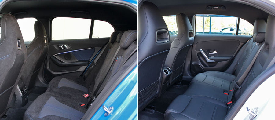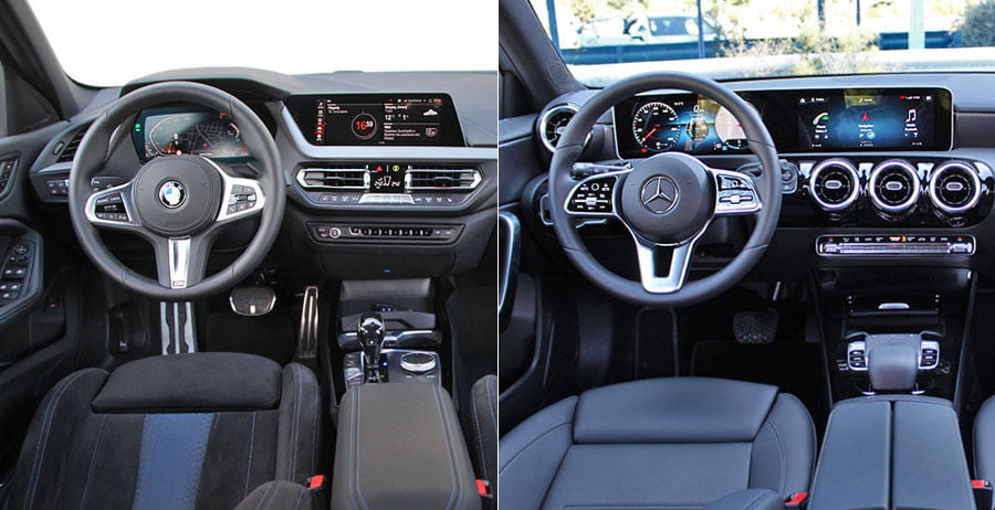 Περνώντας στο εσωτερικό των δύο αυτοκινήτων, ο παρατηρητής έρχεται αντιμέτωπος με δύο διαφορετικούς κόσμους. Το ταμπλό της A-Class θα εντυπωσιάσει πιο πολύ με τις δύο εξτρά οθόνες των 10,25 ιντσών έκαστη (στάνταρ είναι δύο οθόνες 7 ιντσών), οι οποίες δημιουργούν μια λεπτή ενιαία οθόνη. Αντίστοιχα και στην Σειρά 1 διατίθενται προαιρετικά οθόνες 10,25 ιντσών για τον πίνακα οργάνων και το σύστημα πολυμέσων (στάνταρ 8,8 ιντσών). Κοινό στοιχείο και των δύο αυτοκινήτων είναι οι έξυπνες φωνητικές εντολές που ενεργοποιούνται είτε λέγοντας «Hey BMW» ή «Hey Mercedes» και αντίστοιχα ελέγχονται πολλές λειτουργίες, χωρίς ο οδηγός να ψάχνει τα χειριστήρια. Αυτά είναι ούτως ή άλλως λίγα, ενώ ανάμεσα από τα εμπρός καθίσματα υπάρχει το πιο πρακτικό iDrive Controller της BMW με το περιστροφικό χειριστήριο, έναντι του όχι ιδιαίτερα εύχρηστου touchpad της Mercedes. Η θέση οδήγησης είναι πολύ καλή σε κάθε περίπτωση, ωστόσο η δυνατότητα πιο χαμηλής ρύθμισης της θέσης του καθίσματος του οδηγού στην Σειρά 1 θα βολέψει καλύτερα.