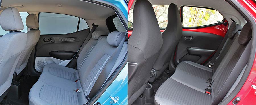 Από πλευράς χώρων, το νέο i10 είναι σε θέση να μετακινήσει χωρίς παραχωρήσεις τέσσερα ενήλικα άτομα. Στο πίσω κάθισμα το πιο μακρύ κατά 85 χιλιοστά μεταξόνιο ευνοεί σημαντικά των αέρα για τα πόδια, ενώ και το ωφέλιμο ύψος είναι μεγαλύτερο. Σημαντικό προβάρισμα έχει το i10 και στο μεγαλύτερο πορτ μπαγκάζ των 252 λίτρων, έναντι των 168 λίτρων του Aygo με το ψηλό παράλληλα κατώφλι φόρτωσης. Στα μείον του Aygo συγκαταλέγονται και τα πίσω παράθυρα που ανοίγουν μόνο προς τα έξω.