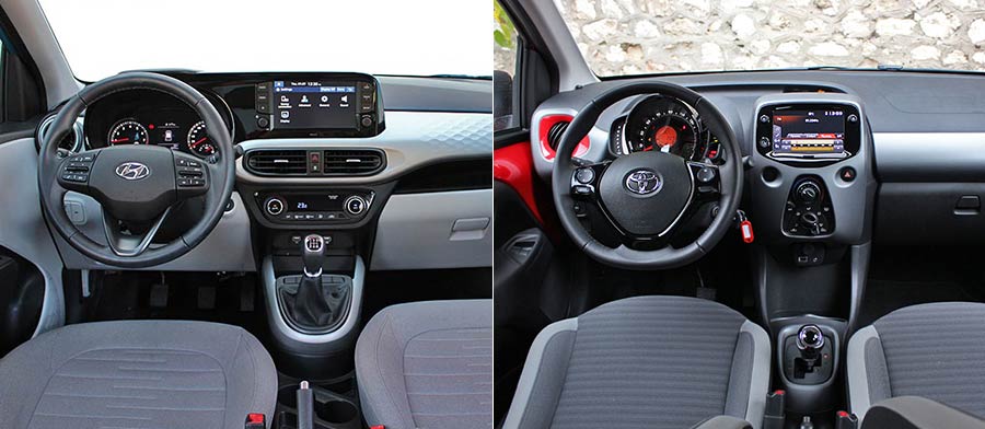 Μπαίνοντας στο εσωτερικό των δύο αυτοκινήτων, το i10 κερδίζει αμέσως τις πρώτες εντυπώσεις, αφού έχει «αέρα» μεγαλύτερου αυτοκινήτου, τόσο σε ποιότητα, όσο και σε χώρους. Στο ανώτερο σημείο της κεντρικής κονσόλας κυριαρχεί η οθόνη του συστήματος πολυμέσων των 8 ιντσών, που ενώνεται με το πλαίσιο του πίνακα οργάνων. Τα ποιοτικά σκληρά πλαστικά είναι στιβαρά συναρμολογημένα και αποτρέπουν τυχόν τριγμούς. Στο Aygo υπάρχουν οι απαραίτητες ευχάριστες πινελιές, όμως τόσο σε ποιότητα υλικών, όσο και σε φινίρισμα βρίσκεται πίσω από το Hyundai. Ειδικά οι επενδύσεις στις πόρτες με τις μεταλλικές επιφάνειες είναι πολύ φτωχές.