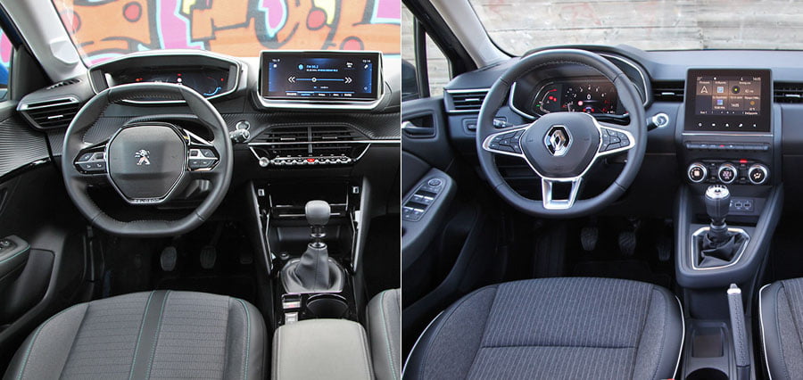 Αμφότερες οι καμπίνες των γαλλικών μικρών διακρίνονται από τις τεχνολογίες που ενστερνίζονται, αλλά και για την πρακτικότητα που προσφέρουν. Όμως το εσωτερικό του Peugeot 208 κερδίζει τις εντυπώσεις, χάρη στο νέας γενιάς Peugeot i-Cockpit. Το ταμπλό χωρίζεται σε τρία επίπεδα: Στο πάνω μέρος, στην έκδοση δοκιμής μας, υπάρχει ο 3D πίνακας οργάνων των 10 ιντσών (η βασική έκδοση έχει αναλογικά όργανα) και η οθόνη αφής των επίσης 10 ιντσών (5 και 10 ιντσών ανάλογα την έκδοση). Ο φουτουριστικός πίνακας οργάνων με το πλαίσιο που προεκτείνεται προς τα έξω και τα ανοίγματα στα πλαϊνά του παραμετροποιείται και προβάλλονται οι πληροφορίες που θέλει ο οδηγός. Όμως, η στεφάνη του τιμονιού κρύβει μέρος των ενδείξεων, ο οποίες για να γίνουν πλήρως ορατές, θα πρέπει ο οδηγός να τοποθετήσει ψηλά το κάθισμα και χαμηλά το τιμόνι. Στη βάση της κεντρικής κονσόλας βρίσκονται οι διακόπτες αεροπορικού τύπου και πίσω από αυτούς χειριστήρια αφής για τις βασικές λειτουργίες του αυτοκινήτου.