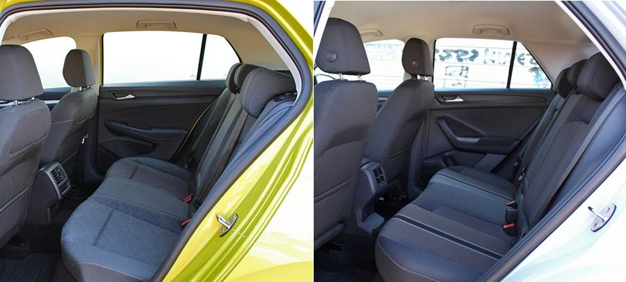 Από χώρους δεν υπάρχει παράπονο σε κανένα από τα δύο αυτοκίνητα. Τέσσερις επιβάτες τακτοποιούνται χωρίς παραχωρήσεις, όμως ένας ακόμα στη μέση του πίσω καθίσματος δεν θα διευκολυνθεί λόγω του ψηλού κεντρικού τούνελ. Όσο για τις αποσκευές, το T-Roc υπερέχει σε πορτ μπαγκάζ με τα 445 λτ. έναντι των 381 λτ. του Golf.