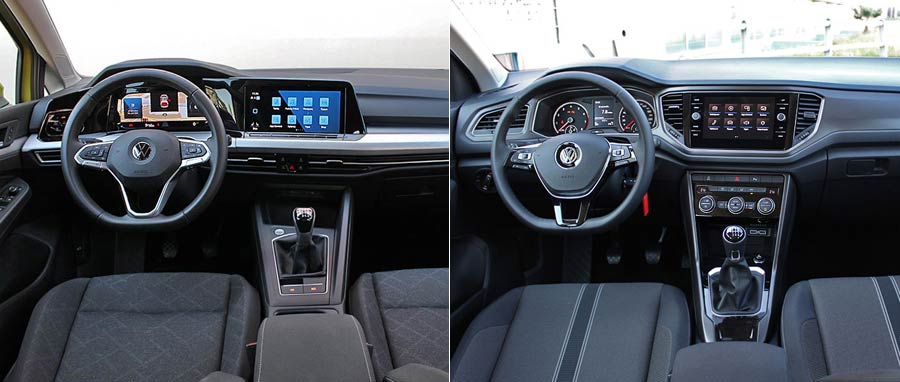 Στο εσωτερικό των δύο VW συναντώνται πολλές διαφορές μεταξύ τους σε ποιότητα, τεχνολογία και σχεδιασμό, με το Golf να κερδίζει τις εντυπώσεις από την πρώτη κιόλας ματιά. Στο εντυπωσιακό ταμπλό του Golf, οι 10 ίντσες του Digital Cockpit ενώνονται με τις 8,25 του συστήματος πολυμέσων, συνθέτοντας μια ψηφιακή πανδαισία (στάνταρ εξοπλισμός). Φυσικοί διακόπτες δεν υπάρχουν, αφού όλα τα χειριστήρια λειτουργούν δια της αφής, κάτι που θέλει λίγη εξοικείωση καθώς ορισμένες φορές δεν «πιάνουν» με τη μία. Αυτό που απαιτεί περισσότερη τριβή, είναι ο έλεγχος των επιμέρους λειτουργιών. Η παντελής έλλειψη διακοπτών σημαίνει πως για να αλλάξεις το παραμικρό, πρέπει να περιηγηθείς σε μενού και υπομενού, όπως για παράδειγμα η απενεργοποίηση του συστήματος start-stop. Η ποιότητα των υλικών βρίσκεται σε κορυφαίο επίπεδο, με παχύ αφρώδες πλαστικό να χρησιμοποιείται στην μεγαλύτερη επιφάνεια ταμπλό και εμπρός θυρών.