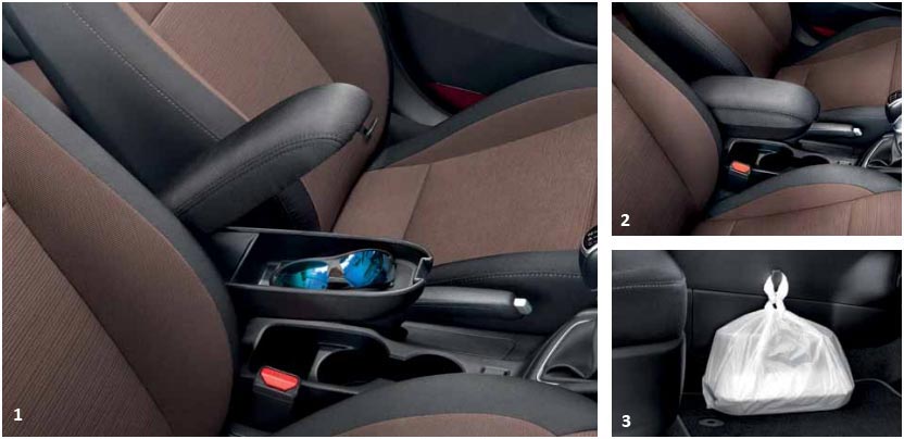1-2. Υποβραχιόνιο μπροστινών καθισμάτων με θήκη. Ξεκουράζει το χέρι σας και προσφέρει και μια επιπλέον χρήσιμη θήκη. Εφαρμόζει στο κάθισμα του οδηγού και ρυθμίζεται ανάλογα με την προτίμησή σας. 3. Γάντζος – κρεμάστρα θέσης συνοδηγού. Τοποθετείται στο πλάι της κεντρικής κονσόλας. Μπορεί να κρατά σακούλες με φαγητό σε πακέτο για να μη λερώσετε το χώρο κατά την μετακίνηση.