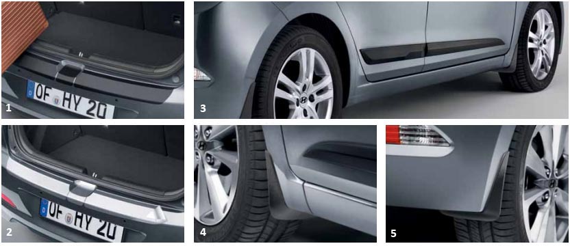1. Μεμβράνη προστασίας πίσω προφυλακτήρα, μαύρη. Προστατεύει από γρατσουνιές και γδαρσίματα κατά τη φορτοεκφόρτωση. 2. Μεμβράνη προστασίας πίσω προφυλακτήρα, διάφανη. Προστατεύει από γρατσουνιές και γδαρσίματα κατά τη φορτοεκφόρτωση. 3. Πλαστικά προστατευτικά πλαϊνών θυρών. Σπορ και κομψά, προστατεύουν από χτυπήματα, ειδικά στα πάρκινγκ. 4-5. Λασπωτήρες. Είτε σε άσχημο καιρό είτε σε δύσκολα εδάφη, προστατεύουν το κάτω μέρος του αυτοκινήτου, τα περβάζια και τις πόρτες από τη λάσπη και τη βρομιά.