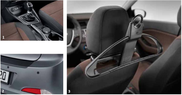 1. Κιτ καπνιστή. Θήκη με καπάκι που εφαρμόζει στην ποτηροθήκη και λειτουργεί ως τασάκι. Περιλαμβάνει και αναπτήρα. 2. Αισθητήρες παρκαρίσματος πίσω. Παράγουν μεταβαλλόμενους ηχητικούς τόνους ανάλογα με την απόσταση των εμποδίων. Οι 4 αισθητήρες μπορούν να βαφτούν στο χρώμα του αυτοκινήτου. 3. Κρεμάστρα κουστουμιού. Τοποθετήστε την εύκολα πίσω από το κάθισμα και φτάστε ατσαλάκωτοι στο γραφείο ή το ξενοδοχείο σας.