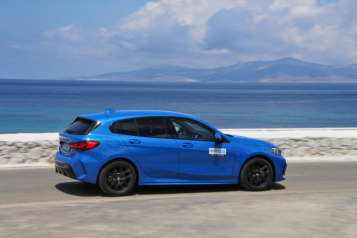 Απόλυτα ταιριαστή με τα χρώματα της Μυκόνου και με τον κοσμοπολίτικο «αέρα» της, ήταν η νέα BMW Σειρά 1 που είχαμε στη διάθεσή μας και συγκεκριμένα η 116d. Το τέλειο μπλε χρώμα Misano Blue, σε συνδυασμό με την έκδοση M Sport και τις 18 ιντσών ζάντες αλουμινίου με ελαστικά 225/40, έκαναν την Σειρά 1 πόλο έλξης, όπου και να βρισκόταν, ανεξαρτήτως ώρας. Από το πρώτο φως του ήλιου που… κυνηγούσαμε για μερικά «κλικ» στη φωτογράφισή της στη Μικρή Βενετία, έως λίγο πριν δύσει ο ήλιος, στο Φάρο, αλλά και στις παραλίες Ορνός και Πλατύς Γιαλός. Ο σπορ και πολυτελής χαρακτήρας της μικρομεσαίας BMW, ωθεί πιο πολύ τον οδηγό στο να βρίσκεται συνεχώς στο τιμόνι της και να απολαμβάνει τις άφθονες δόσεις οδηγικής ευχαρίστησης που προσφέρει, από τις πιο κοντινές, έως τις πιο μακρινές αποστάσεις.