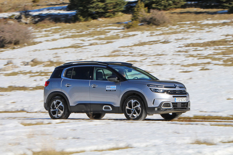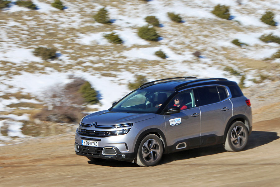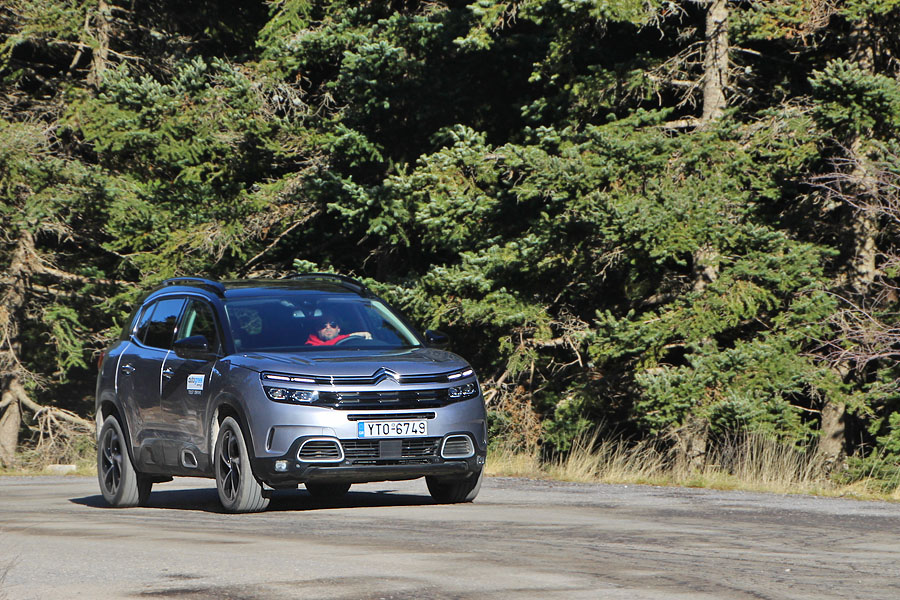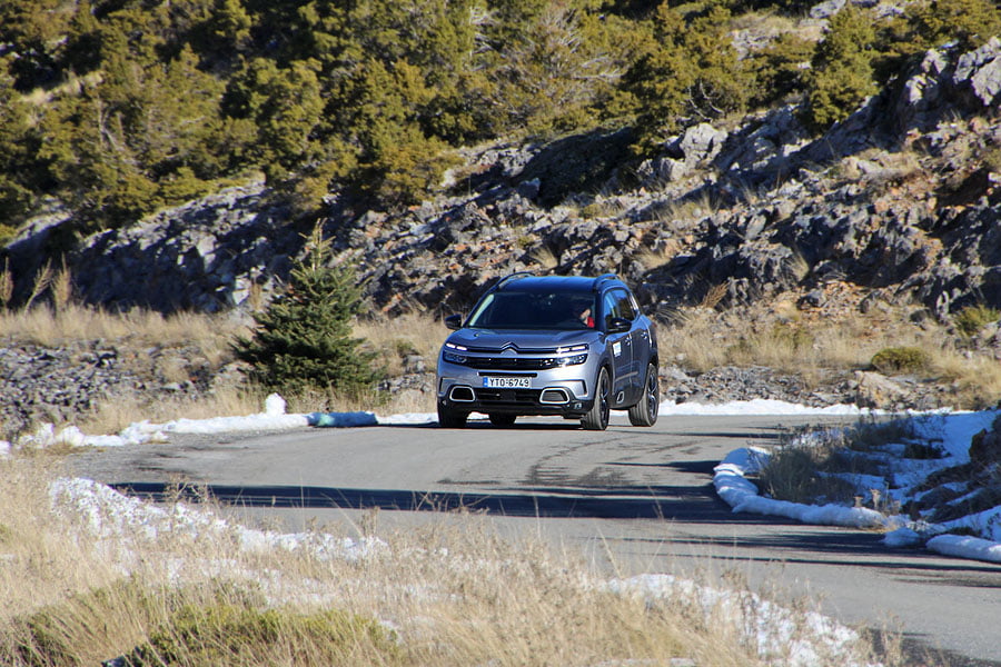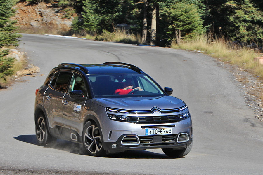 Εξίσου «αρχοντικό» πάτημα έχει το C5 Aircross και στις επαρχιακές «σφιχτές» διαδρομές, παρά τον όγκο του (μήκος 4.500 χλστ., πλάτος 1.840 χλστ., ύψος 1.654 χλστ. και μεταξόνιο 2.730 χλστ.). Εκεί, το αμάξωμα παρουσιάζει μικρές κλίσεις, τα όρια πρόσφυσης είναι υψηλά και το αυτοκίνητο είναι ιδιαίτερα ασφαλές, ακόμα και όταν ο οδηγός «ξεφύγει» από τους οικογενειακούς ρυθμούς. Επίσης, είναι σε θέση να εκμεταλλευτεί πλήρως τα αποθέματα ισχύος του κινητήρα, καθώς είναι αποδοτικός μέχρι τις υψηλές στροφές. Παράλληλα, ο εύχρηστος επιλογέας διευκολύνει στις γρήγορες εναλλαγές των ταχυτήτων.