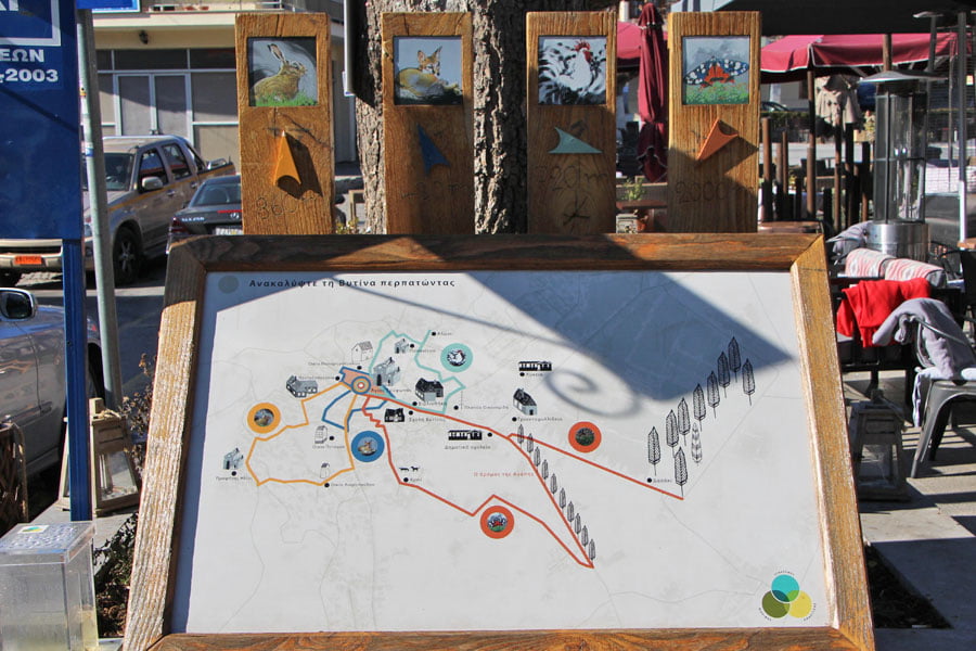 Επιστροφή στην άσφαλτο και κατεύθυνση προς το ορεινό χωριό της Βυτίνας, το οποίο βρίσκεται σε υψόμετρο 1.030 μέτρων. Ο «δρόμος της αγάπης» είναι ένα από τα αξιοθέατα του χωριού και το τοπίο είναι παραμυθένιο με τη διαδρομή ανάμεσα στα δέντρα. Στην πλατεία της Βυτίνας και γύρω από αυτή υπάρχουν καφέ και ταβέρνες, αλλά και μαγαζιά με πολλά παραδοσιακά προϊόντα, όπως μέλι, καρύδια, ζυμαρικά, όσπρια, βότανα, αρωματικά φυτά κ.α. Τα πετρόκτιστα σπίτια είναι απόλυτα εναρμονισμένα με το περιβάλλον, όπως και τα ξενοδοχεία που βρίσκονται μέσα στη Βυτίνα αλλά και κοντά σε αυτή. Ο επισκέπτης απολαμβάνει πλήθος παροχών και σίγουρα ένα τριήμερο είναι ότι πρέπει για να περιηγηθεί σε όλα αυτά τα μέρη να γεμίσει με μοναδικές εικόνες.