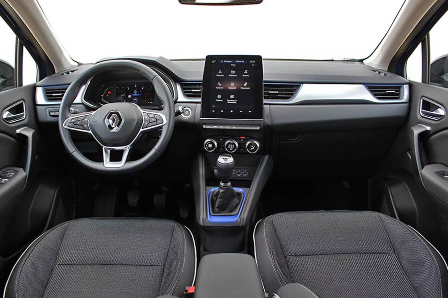 Την πλήρως αναβαθμισμένη εικόνα του B-SUV της Renault, την εισπράττει άμεσα όποιος εισέρχεται στο εσωτερικό του. Στο επίκεντρο του ενδιαφέροντος βρίσκεται η κάθετη οθόνη των 7 ή 9,3 ιντσών του συστήματος infotainment Easy Link, καθώς και ο ψηφιακός πίνακας οργάνων των 7 ή 10,2 ιντσών. Την άρτια εικόνα συμπληρώνει η σημαντικά αναβαθμισμένη ποιότητα κατασκευής, μέσω της ευρείας χρήσης μαλακών πλαστικών σε ολόκληρο το ταμπλό, στην κονσόλα και στις μπροστινές πόρτες. Επιπλέον στοιχεία που εκτιμήσαμε στο νέο Captur είναι η ψηλή και βολική θέση οδήγησης, τα αναπαυτικά καθίσματα και οι πολλές θήκες, συμπεριλαμβανομένου του μεγάλου συρταριού από την πλευρά του συνοδηγού. Στα θετικά του στοιχεία ανήκουν ακόμα οι άνετοι χώροι, το πίσω συρόμενο κάθισμα και το μεγάλο πορτ μπαγκάζ που φτάνει έως τα 536 λίτρα.