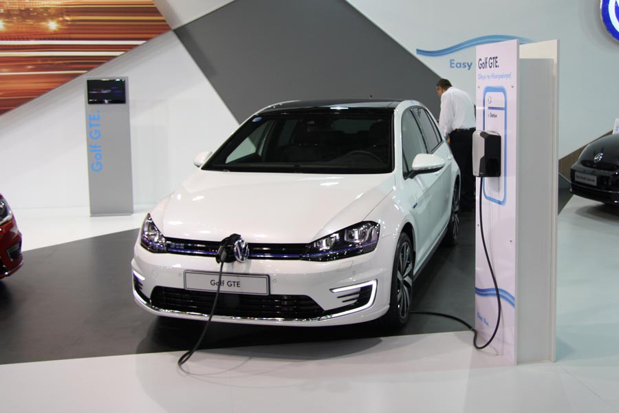 Ιδιαίτερο ενδιαφέρον στον εκθεσιακό χώρο της Volkswagen συγκεντρώνει και το πρώτο υβριδικό plug-in Golf με τα εντυπωσιακά χαρακτηριστικά συνδυασμού απόδοσης. Το Golf GTE τροφοδοτείται με κινητήρα 1.4 TSI 150 PS μαζί με ηλεκτροκινητήρα ισχύος 102 ίππων, συνδυαστικής απόδοσης 204 ίππων και 350 Nm ροπής. Η μεικτή κατανάλωση του Golf GTE ανέρχεται στο μόλις 1,5 λτ./100 χλμ. και οι εκπομπές CO2 στα 35 γρ./χλμ., ενώ από πλευράς επιδόσεων τα 0-100 χλμ./ώρα επιτυγχάνονται σε 7,6 δλ. και η τελική ταχύτητα αγγίζει τα 222 χλμ./ώρα.