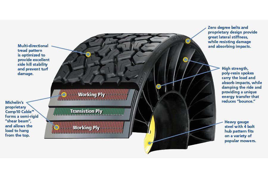 Η Michelin ξεκινά την παραγωγή των πρωτοποριακών ελαστικών X Tweel, τα οποία δεν σκάνε ποτέ, έχουν υψηλή διάρκεια ζωής, δεν χρειάζονται αέρα αλλά ούτε και ζάντα! Το εξωτερικό τους πέλμα δε διαφέρει από το αντίστοιχο ενός παραδοσιακού ελαστικού, ωστόσο σύμφωνα με τη Michelin έχει έως 3 φορές περισσότερη διάρκεια. Η ακτίνες αποτελούνται από υψηλής αντοχής και ελαστική πολύ-ρητίνη, οι οποίες παράλληλα λειτουργούν και ως ανάρτηση απορροφώντας τις διάφορες ανωμαλίες. Σε πρώτη φάση η παραγωγή των Michelin X Tweel ξεκινά στη Νότια Καρολίνα των Η.Π.Α. και προορίζονται για ειδικά οχήματα, όπως μικρά χωματουργικά και το χλοοκοπτικό που παρουσιάζεται στο βίντεο.