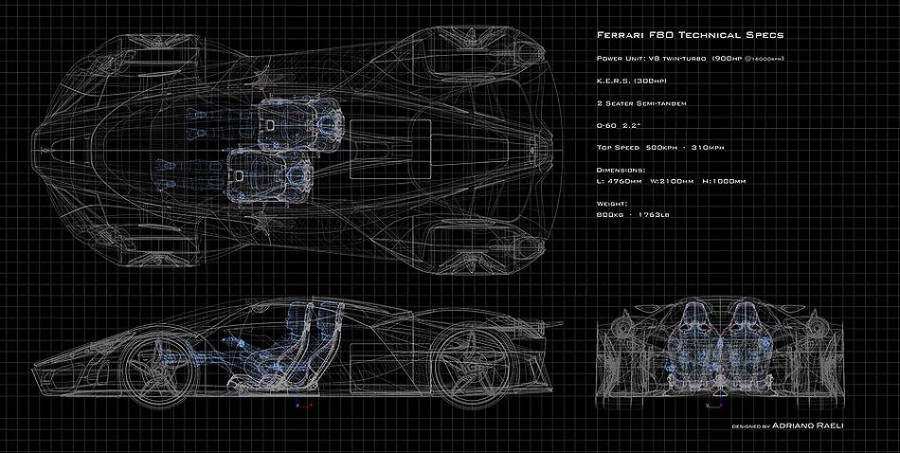 Εκτός από τα σχέδια του άκρως φουτουριστικού supercar, παρουσιάζει και σχεδιάγραμμα με τις διαστάσεις και τα τεχνικά χαρακτηριστικά του μοντέλου. Η εικονική F80 concept έχει μήκος 4.760 χλστ., πλάτος 2.100 χλστ., ύψος 1.000 χλστ. και ζυγίζει μόλις 800 κιλά. Για την τροφοδοσία της υπάρχει υβριδικό σύνολο με V8 Twinturbo ισχύος 900 ίππων και ηλεκτροκινητήρα 300 ίππων, ενώ τα 0-96 χλμ./ώρα επιτυγχάνονται μέχρι να πεις γρήγορα «Ferrari LaFerrari», σε 2,2 δευτερόλεπτα.