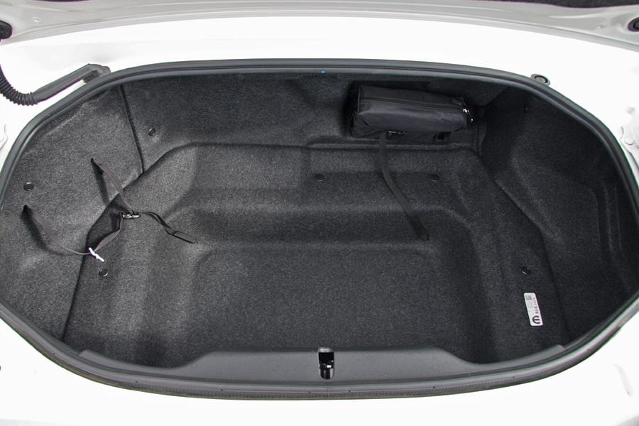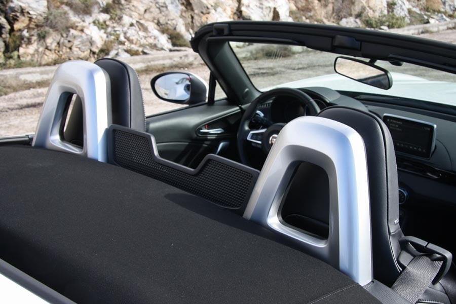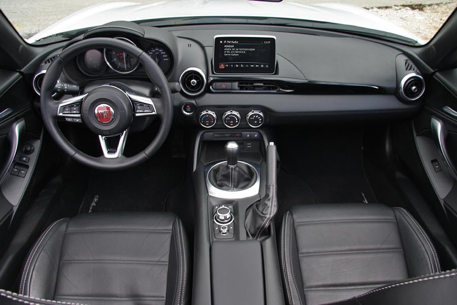 Μπαίνοντας στο εσωτερικό του Fiat 124 Spider το βλέμμα σου θα πέσει κατευθείαν στην οθόνη 7,0 ιντσών την οποία χειρίζεσαι μέσω του πιεζοπεριστροφικού διακόπτη. Αυτός είναι τοποθετημένος σε σωστή θέση για… δεξιοτίμονο αυτοκίνητο (δηλαδή για ιαπωνικό MX-5). Στην Ευρώπη όμως οδηγούμε αριστερά και έτσι το δεξί μας χέρι πέφτει ακριβώς επάνω του, έχοντας ως αποτέλεσμα ανεπιθύμητες αλλαγές σε σταθμούς ραδιοφώνου, σύστημα πλοήγησης κλπ… Από αυτόν λοιπόν, χειρίζεσαι τα συστήματα ψυχαγωγίας αλλά και δευτερεύουσες λειτουργίες του αυτοκινήτου. Παρατηρώντας περισσότερο την καμπίνα βλέπεις πως η ποιότητα των υλικών είναι πολύ καλή, το φινίρισμά τους δεν παρουσιάζει ατέλειες, ενώ η συναρμολόγησή τους μοιάζει ακλόνητη. Όταν κάτσεις στο μπάκετ κάθισμα πίσω από το τιμόνι θα βολευτείς πλήρως αν έχεις… ιαπωνικό ανάστημα. Αν είσαι όμως πιο κοντά σε… μεγαλόσωμο Ιταλό, τότε μάλλον θα βρεις στενή την πλάτη του καθίσματος και θα απορήσεις που το τιμόνι δεν ρυθμίζεται σε απόσταση αλλά μόνο πάνω-κάτω. Παρόλα αυτά το κάθισμα έχει όλες τις ρυθμίσεις και σε μεγάλο εύρος. Ο πίνακας οργάνων είναι μία σύνθεση ψηφιακών και αναλογικών ενδείξεων. Στο κέντρο του δεσπόζει το αναλογικό στροφόμετρο με το μικρό, ψηφιακό πλαίσιο στο εσωτερικό του, το οποίο δείχνει την επιλεγμένη σχέση αλλά και την ιδανική σχέση για βελτιστοποίηση της κατανάλωσης. Δεξιά του βρίσκεται το επίσης αναλογικό ταχύμετρο, ενώ αριστερά υπάρχει ψηφιακή οθόνη με τις ενδείξεις της θερμοκρασίας κινητήρα, της στάθμης καυσίμου και του υπολογιστή ταξιδιού. Πάντως οι Ιταλοί δεν πρέπει να ξόδεψαν χρόνο για να δημιουργήσουν θήκες μικροαντικειμένων στο εσωτερικό, αφού πρακτικά αυτές είναι… ανύπαρκτες. Ντουλαπάκι συνοδηγού και ποτηροθήκες λάμπουν δια της απουσίας τους. Υπάρχει μόνο ένας μεγάλος αποθηκευτικός χώρος, προσβάσιμος από ντουλαπάκι, ανάμεσα στα καθίσματα. Όσον αφορά τον χώρο αποσκευών, αυτός είναι στα 140 λίτρα και το άνοιγμά του επιτρέπει μόνο κάθετη φόρτωση (το πίσω καπό δεν ανοίγει μαζί με το πλαίσιο πινακίδας ή μέρος των φώτων αλλά σαν καπάκι για τον χώρο αποσκευών).
