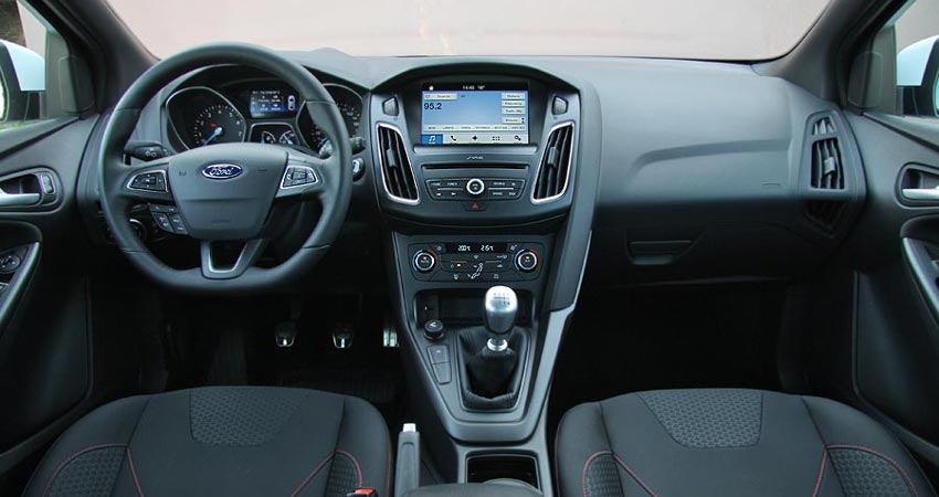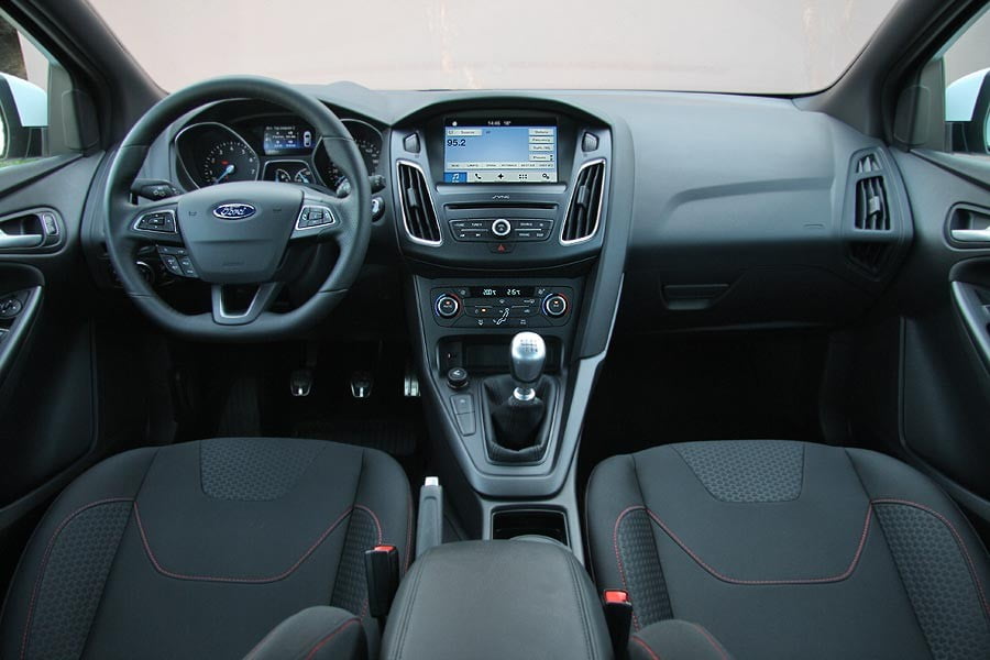 Όπως και στο αμάξωμα, έτσι και στο εσωτερικό του νέου Focus ST-Line η Ford έχει προβεί σε μια σειρά από αλλαγές που χαρίζουν στο θάλαμο μια πιο σπορτίφ εικόνα. Με την πρώτη ματιά ξεχωρίζουν τα πιο σπορ καθίσματα με κόκκινες ραφές, το δερμάτινο τιμόνι επίσης με γκρι ραφές και σχεδίαση α λα Focus ST, αλλά και ο δερμάτινος επιλογέας ταχυτήτων με αλουμινένιο πάνω τμήμα. Τα πεντάλ διαθέτουν επενδύσεις αλουμινίου, η λαβή του χειρόφρενου είναι δερμάτινη, ενώ και η οροφή έρχεται με μαύρη επένδυση. Από εκεί και πέρα, το εσωτερικό του Focus ST-Line συνεχίζει να διαθέτει μια πολύ σύγχρονη και μοντέρνα εικόνα, με άρχουσα τη μεγάλη οθόνη αφής 8 ιντσών του αναβαθμισμένου συστήματος πολυμέσων SYNC 3 στο πάνω μέρος της κονσόλας. Η ποιότητα των υλικών, μέσω και της χρήσης μαλακού στην αφή πλαστικού, είναι πολύ καλή, με το φινίρισμα και τη συναρμογή να κρίνονται συνολικά προσεγμένα. Αντίστοιχα, η θέση οδήγησης είναι από τις καλύτερες στην κατηγορία και ενισχύεται περαιτέρω στο ST-Line λόγω των καθισμάτων με την βελτιωμένη στήριξη που δεν κουράζουν. Στους χώρους, το Focus είναι σε θέση να φιλοξενήσει 4 ενήλικες επιβάτες όμως ένας 5ος δύσκολα θα χωρέσει λόγου του διαθέσιμου πλάτους, με το πορτ-μπαγκάζ να διαθέτει καλή χωρητικότητα 363 λίτρων (με κιτ επισκευής ελαστικού, 316 λίτρα με ρεζέρβα ανάγκης).