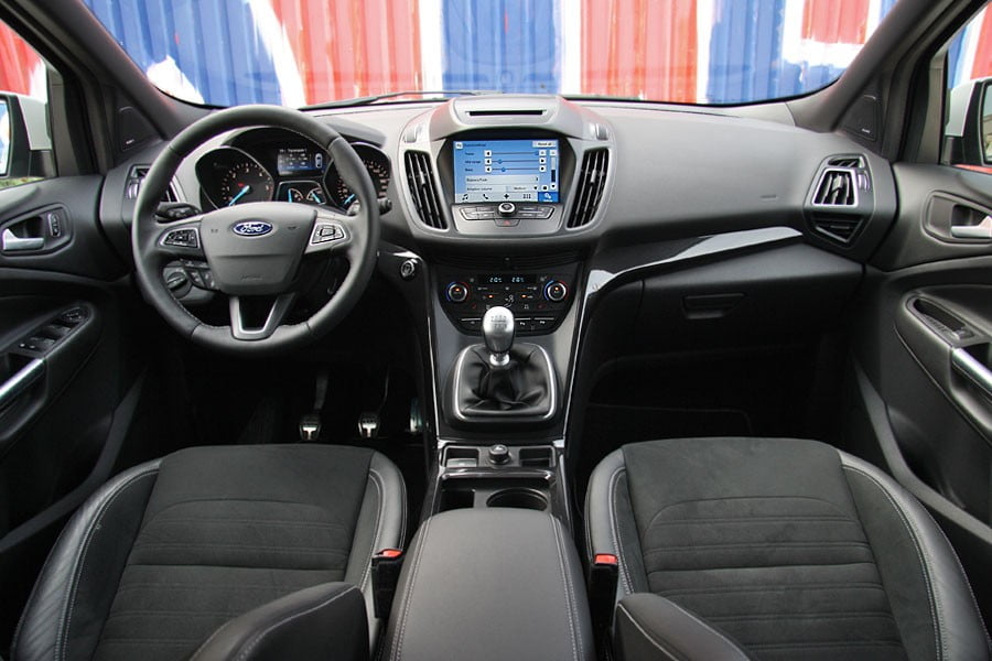 Στο εσωτερικό του ανανεωμένου Kuga η Ford βελτίωσε την εργονομία, ενώ παράλληλα αναβάθμισε σε τεχνολογία τα διάφορα συστήματά του. Αρχικά ξεχωρίζει το νέο τιμόνι που περιλαμβάνει πιο εύχρηστα πλήκτρα χειρισμού και κατόπιν το νέας γενιάς σύστημα πολυμέσων SYNC 3, με εντελώς καινούργιο λειτουργικό, στάνταρ σκληρό δίσκο χωρητικότητας 64 GB και σύστημα πλοήγησης. Νέα είναι ακόμα τα χειριστήρια για τον κλιματισμό και το πρακτικό ηλεκτρικό χειρόφρενο, που αφήνει περισσότερο χώρο για μικροαντικείμενα. Το Kuga ST-Line εφοδιάζεται με σπορ καθίσματα με μερική επένδυση δέρματος και ραφές αντίθετου χρώματος στον επιλογέα ταχυτήτων και τιμόνι, μαύρη οροφή και διακοσμητικό μεταλλικού χρώματος στην κονσόλα. Σε επίπεδο ποιότητας κατασκευής, τα μαλακά πλαστικά στο ταμπλό και τα επιμέρους σκληρά είναι πολύ καλά, ωστόσο στον τομέα του φινιρίσματος και συναρμογής υπάρχουν περιθώρια βελτίωσης. Από πλευράς χώρων, το εσωτερικό του Kuga θα φιλοξενήσει με άνεση έως πέντε ενήλικους επιβάτες μαζί με τις αποσκευές τους (456 λτ.).