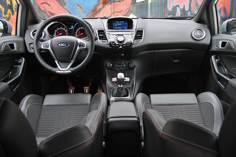Το εσωτερικό του Ford Fiesta ST200 δεν έχει να επιδείξει κάποια μοναδικότητα… συγκρινόμενο με αυτό του… απλού ST. Και εδώ η καμπίνα του αυτοκινήτου διαθέτει σπορ καθίσματα Recaro με το λογότυπο ST, τα οποία είναι ημι-δερμάτινα με διακριτικές ραφές, ταπέτα δαπέδου εμπρός και πίσω με το λογότυπο ST και σκούρα, πλεκτή επένδυση οροφής και φωτιζόμενο μασπιέ με το λογότυπο ST. Το τιμόνι είναι δερμάτινο και έχει το σήμα ST. Τις αλλαγές αυτές τις συναντάμε και στο Ford Fiesta ST, σε σχέση με τις απλές εκδόσεις του. Έτσι, το μόνο σημείο στο οποίο διαφέρουν οι δύο εκδόσεις είναι στην κεντρική κονσόλα και στο σήμα ST200 που φιγουράρει εκεί. Πάντως είναι καλοεξοπλισμένο καθώς διαθέτει προηγμένο σύστημα πολυμέσων με αυξημένες δυνατότητες συνδεσιμότητας, ενώ περιλαμβάνεται ο αυτόματος κλιματισμός, το cruise control και η υποβοήθηση παρκαρίσματος με κάμερα οπισθοπορείας. Συνολικά, η καμπίνα του Fiesta ST200 ικανοποιεί με τα ποιοτικά υλικά και το αξιόλογο φινίρισμα. Σε επίπεδο χώρων, τα ογκώδη εμπρός bucket «κλέβουν» λίγο χώρο από τα γόνατα των πίσω επιβατών, χωρίς βέβαια αυτό να σημαίνει πως το διαθέσιμο περιθώριο δεν είναι αρκετό για τα γόνατα ενηλίκων κανονικού αναστήματος. Με όγκο 290 λίτρων και με αρκετά εκμεταλλεύσιμο σχήμα, το πορτμπαγκάζ κρίνεται ευρύχωρο και πρακτικό.