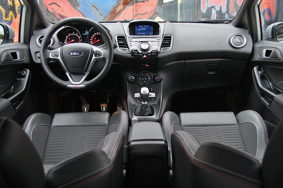 Το εσωτερικό του Ford Fiesta ST200 δεν έχει να επιδείξει κάποια μοναδικότητα… συγκρινόμενο με αυτό του… απλού ST. Και εδώ η καμπίνα του αυτοκινήτου διαθέτει σπορ καθίσματα Recaro με το λογότυπο ST, τα οποία είναι ημι-δερμάτινα με διακριτικές ραφές, ταπέτα δαπέδου εμπρός και πίσω με το λογότυπο ST και σκούρα, πλεκτή επένδυση οροφής και φωτιζόμενο μασπιέ με το λογότυπο ST. Το τιμόνι είναι δερμάτινο και έχει το σήμα ST. Τις αλλαγές αυτές τις συναντάμε και στο Ford Fiesta ST, σε σχέση με τις απλές εκδόσεις του. Έτσι, το μόνο σημείο στο οποίο διαφέρουν οι δύο εκδόσεις είναι στην κεντρική κονσόλα και στο σήμα ST200 που φιγουράρει εκεί. Πάντως είναι καλοεξοπλισμένο καθώς διαθέτει προηγμένο σύστημα πολυμέσων με αυξημένες δυνατότητες συνδεσιμότητας, ενώ περιλαμβάνεται ο αυτόματος κλιματισμός, το cruise control και η υποβοήθηση παρκαρίσματος με κάμερα οπισθοπορείας. Συνολικά, η καμπίνα του Fiesta ST200 ικανοποιεί με τα ποιοτικά υλικά και το αξιόλογο φινίρισμα. Σε επίπεδο χώρων, τα ογκώδη εμπρός bucket «κλέβουν» λίγο χώρο από τα γόνατα των πίσω επιβατών, χωρίς βέβαια αυτό να σημαίνει πως το διαθέσιμο περιθώριο δεν είναι αρκετό για τα γόνατα ενηλίκων κανονικού αναστήματος. Με όγκο 290 λίτρων και με αρκετά εκμεταλλεύσιμο σχήμα, το πορτμπαγκάζ κρίνεται ευρύχωρο και πρακτικό.