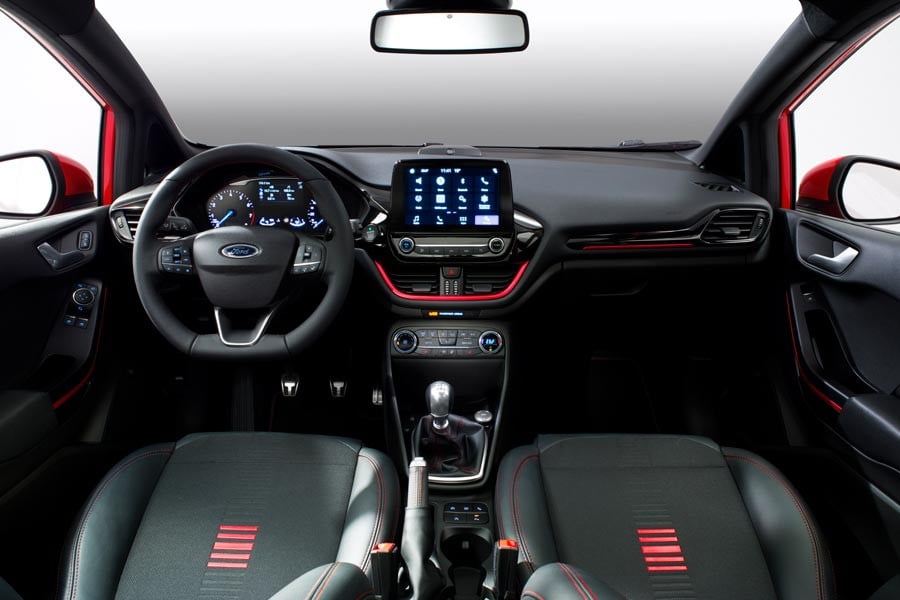 Εντελώς νέο είναι και το εσωτερικό του Fiesta, όπου κυριαρχεί η μεγάλη οθόνη 8 ιντσών του SYNC 3 στο κέντρο του ταμπλό, η οθόνη TFTτων 4,2 ιντσών στον πίνακα οργάνων, τα εμφανώς πιο λίγα χειριστήρια (τα μισά από πριν) και η πιο μινιμάλ αισθητική. Σύμφωνα με την Ford «Το εσωτερικό του Fiesta είναι επαναστατικό ως προς τη σχεδίαση και τη χρήση υλικών». Οι πίσω επιβάτες απολαμβάνουν περισσότερο χώρο για τα γόνατα κατά 16 χλστ., ενώ όλοι έχουν στη διάθεσή τους πολλούς αποθηκευτικούς χώρους, μικρούς και μεγάλους.