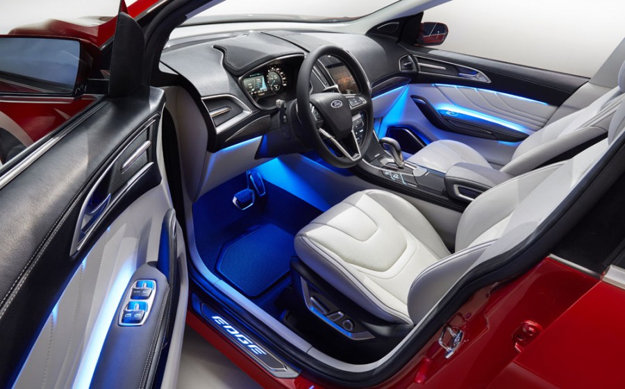 Στην καμπίνα ο πολυτελής εξοπλισμός εσωτερικού περιλαμβάνει ταμπλό με δερμάτινη επένδυση και χειροποίητη ραφή, κεντρική οθόνη 10-ιντσών με Ford SYNC, Voice Control και Touchscreen, και μία δυναμική κεντρική κονσόλα με διακόπτες & μπουτόν ελέγχου λειτουργιών, χρώμιο στο υποβραχιόνιο, το πλαίσιο της λαβής της πόρτας και τους αεραγωγούς, ‘αιωρούμενο’ κάλυμμα ταμπλό οργάνων, καλύμματα μαρσπιέ με γυαλιστερό αλουμινένιο φινίρισμα, μαύρη ματ βαφή και LED φωτισμό στο λογότυπο “Edge”.