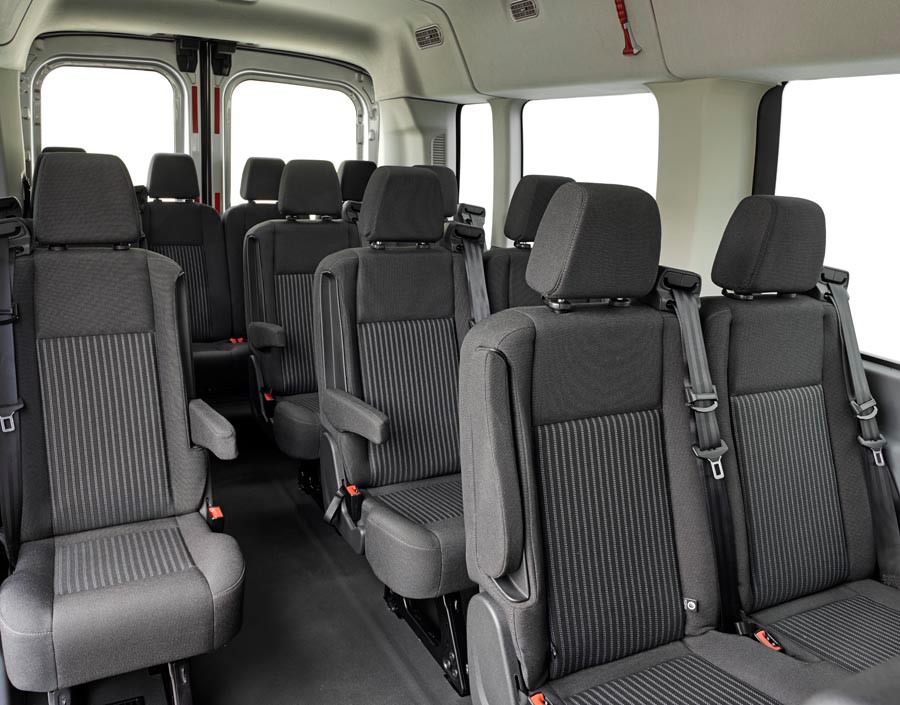 Η καμπίνα του νέου Transit Minibus είναι πλήρως εξοπλισμένη, ενώ εμφανής είναι η χρήση premium, ανθεκτικών υλικών που χαρίζουν ποιότητα επιπέδου επιβατικού αυτοκινήτου. Τα πλαϊνά παράθυρα είναι κατά 200 mm ψηλότερα συγκριτικά με του προηγούμενου μοντέλου για καλύτερη ορατότητα και πιο φωτεινό και ευχάριστο περιβάλλον. Κάθε επιβάτης έχει στη διάθεσή του ατομικό κρεμαστάρι, ενώ ποτηροθήκες υπάρχουν σε όλες τις σειρές καθισμάτων.