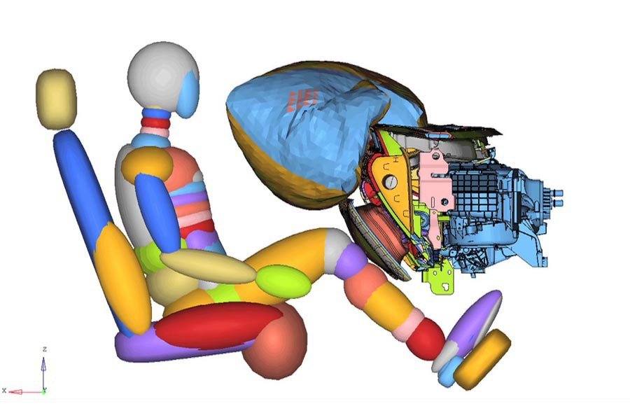 Με μόλις 46 εκατοστά μήκος και 28 εκατοστά πλάτος, ο αερόσακος γονάτων του συνοδηγού ζυγίζει 65% λιγότερο και καταλαμβάνει 75% λιγότερο χώρο από ό, τι ένας συμβατικός αερόσακος γονάτων, ενώ προσφέρει παρόμοια προστασία. Σε περίπτωση σύγκρουσης, μια μικροσκοπική κάψουλα αερίου στο εσωτερικό της πόρτας από το ντουλαπάκι διογκώνει την τον αερόσακο σε μόλις 20 χιλιοστά του δευτερολέπτου, ωθώντας προς τα έξω την εξωτερική πόρτα, έτσι ώστε να παρέχει προστασία των ποδιών. Παράλληλα, ο σχεδιασμός του επιτρέπει μεγαλύτερη ευελιξία στους σχεδιαστές και μεγαλύτερη ευχέρεια χώρου αφού το ταμπλό μπορεί να είναι πιο κοντά προς το παρμπρίζ.