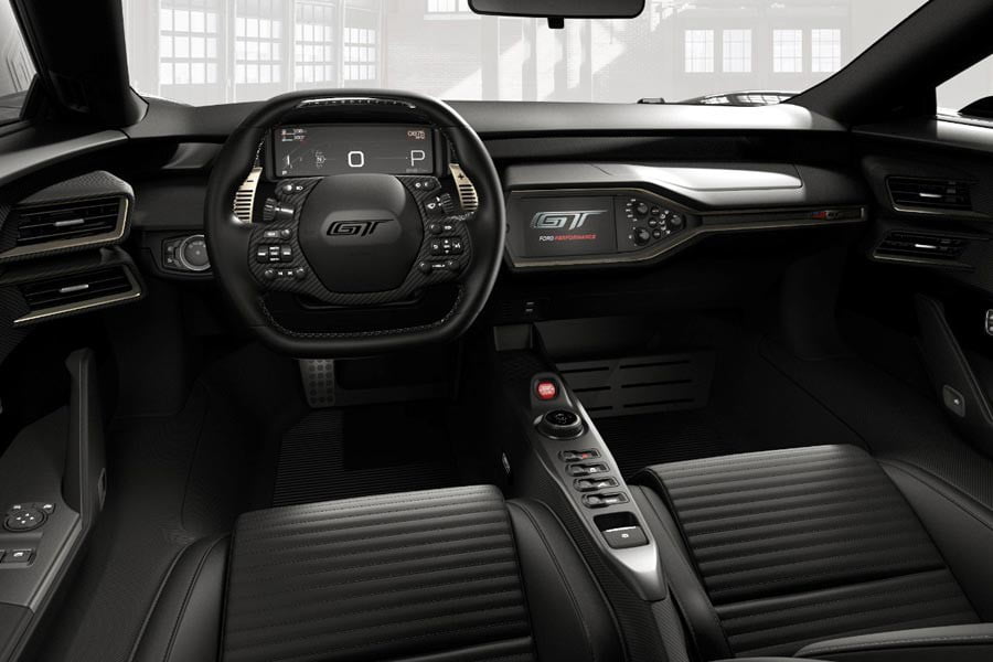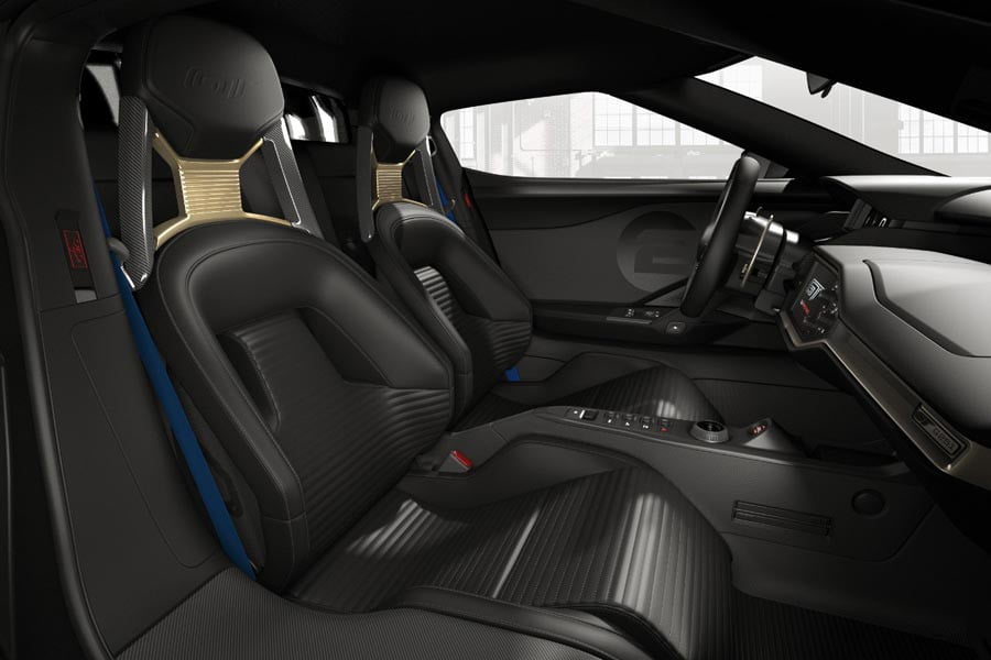 Στο εσωτερικό του περιορισμένης παραγωγής GT, τα καθίσματα από ανθρακόνημα είναι επενδυμένα με μαύρο δέρμα, στα προσκέφαλα και στο τιμόνι υπάρχει το λογότυπο Ford GT, καθώς και διακοσμητικά σε χρυσαφί απόχρωση. Όπως και στο αγωνιστικό αυτοκίνητο του 1966, έτσι και στο σύγχρονο επετειακό Ford GTτο τιμόνι είναι ντυμένο με δέρμα και οι ζώνες ασφαλείας έχουν μπλε χρώμα.