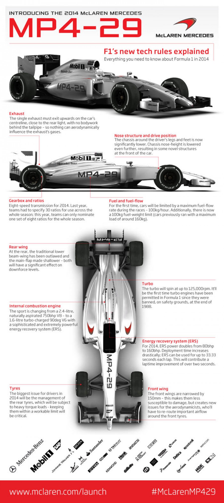 Πρεμιέρα έκανε σήμερα το μεσημέρι η νέα Formula 1 McLaren Mercedes MP4-29 με πάρα πολλές αλλαγές σε σχεδίαση και φυσικά σε κινητήρα, ενώ από το 2015 θα συνεργαστεί με την Honda. Ξεκινώντας από το μοτέρ, ο ατμοσφαιρικός V8 των 2.4 λίτρων με τους 750 ίππους δίνει την θέση του -σύμφωνα με τους νέους κανονισμούς-, σε ένα υβριδικό V6 Turbo 1.6 λίτρων με σύστημα ανάκτησης ενέργειας και 8τάχυτο πλέον κιβώτιο, ενώ να σημειώσουμε πως οι turbo στην F1 απαγορεύτηκαν για λόγους ασφαλείας το 1988. Οι αεροδυναμικές αλλαγές γίνονται άμεσα ορατές με την χαρακτηριστική εμπρός μύτη, η οποία παράλληλα χαμήλωσε και άλλο, όπως και η θέση οδήγησης.