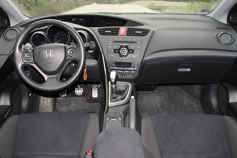 Το εσωτερικό του Civic διαθέτει και αυτό μια εντελώς διαφορετική σχεδίαση από τα συνηθισμένα, με το ταμπλό και το τούνελ της κονσόλας να “αγκαλιάζουν” τον οδηγό και να παραπέμπουν σε κουπέ μοντέλα. Ξεχωριστές πινελιές δίνει και το τοποθετημένα ψηλά ψηφιακό ταχύμετρο, που ανεξαρτητοποιείται του υπολοίπου πίνακα οργάνων, ενώ ακριβώς δίπλα του φιλοξενεί και μια μεγάλη ψηφιακή οθόνη πληροφοριών. Στο κομμάτι της ποιότητας, το μεγαλύτερο τμήμα του ταμπλό στο Civic επενδύεται από αφρώδες πλαστικό, ενώ το φινίρισμα και εφαρμογή σε όλες τις επιφάνειες, βρίσκονται σε υψηλά επίπεδα. Από πλευράς χώρων, το Civic κερδίζει τις εντυπώσεις, προσφέροντας ευρυχωρία για έως και 5 ενήλικες επιβάτες, ενώ διαθέτει και ένα από τα μεγαλύτερα πορτ-μπαγκάζ στην κατηγορία (407 λίτρα). Σήμα κατατεθέν και αυτής της γενιάς Civic αποτελούν τα πολύ πρακτικά πίσω καθίσματα Magic Seats, η βάση των οποίων μπορεί να αναδιπλωθεί, δημιουργώντας ένα δεύτερο χώρο για αποσκευές.
