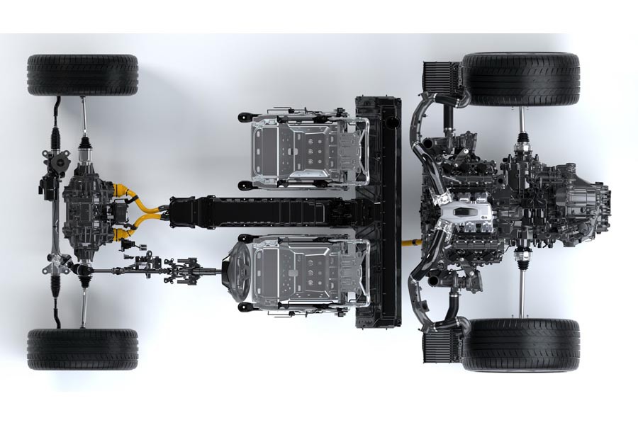 Στο κέντρο του αμαξώματος είναι τοποθετημένος ένας V6 twin-turbo κινητήρας συνδυασμένος με νέο διπλού συμπλέκτη 9 ταχυτήτων DCT κιβώτιο, το οποίο εξασφαλίζει γρήγορες αλλαγές. Το μηχανικό αυτό σύνολο συνεργάζεται με ένα ηλεκτρικό μοτέρ τοποθετημένο κοντά στη μετάδοση, ενώ οι εμπρός τροχοί κινούνται από δύο ανεξάρτητους ηλεκτροκινητήρες υψηλής απόδοσης εξασφαλίζοντας άμεση απόκριση με μηδενική υστέρηση.