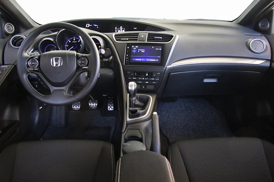 Στο εσωτερικό του ανανεωμένου Honda Civic υπάρχουν νέες ταπετσαρίες καθισμάτων και ραφές στα προσκέφαλα, νέες επενδύσεις θυρών με χρωμιωμένες λαβές και πίνακα ελέγχου σε μαύρο μεταλλικό χρωματισμό. Η οικογένεια Civic 2015 σηματοδοτεί επίσης την πρεμιέρα του συστήματος ήχου & ενημέρωσης Honda Connect το οποίο προσφέρει άνεση και συνδεσιμότητα κατά τη διάρκεια του ταξιδιού με βασικές λειτουργίες όπως: AM/FM, DAB και Internet Radio, συνδεσιμότητα Bluetooth, internet browsing, δορυφορική πλοήγηση και κάμερα οπισθοπορείας. Το σύστημα τρέχει με λειτουργικό Android 4.0.4 και προσφέρει τις οικείες λειτουργίες αφής ενός smartphone σε οθόνη επτά ιντσών που βρίσκεται στην κεντρική κονσόλα. Σχεδιαστικά δεν χρειάστηκε να αλλάξει κάτι, αφού το εσωτερικό του Civic είναι από τα πιο μοντέρνα που συναντά κανείς σε μικρομεσαίο αυτοκίνητο. Ποιοτικά, το μεγαλύτερο τμήμα του ταμπλό του Civic είναι κατασκευασμένο από παχύ αφρώδες πλαστικό, ενώ το φινίρισμα και εφαρμογή σε όλες τις επιφάνειες βρίσκονται σε υψηλά επίπεδα. Μεταξύ των πλεονεκτημάτων του Civic είναι οι άνετοι χώροι για όλους τους επιβάτες και το μεγάλο και τετραγωνισμένο πορτ μπαγκάζ των 407 λίτρων ενώ την πρακτικότητα ενισχύουν τα πολύ πρακτικά πίσω καθίσματα Magic Seats, η βάση των οποίων μπορεί να ανασηκωθεί, διευκολύνοντας τη μεταφορά ψηλών αντικειμένων.