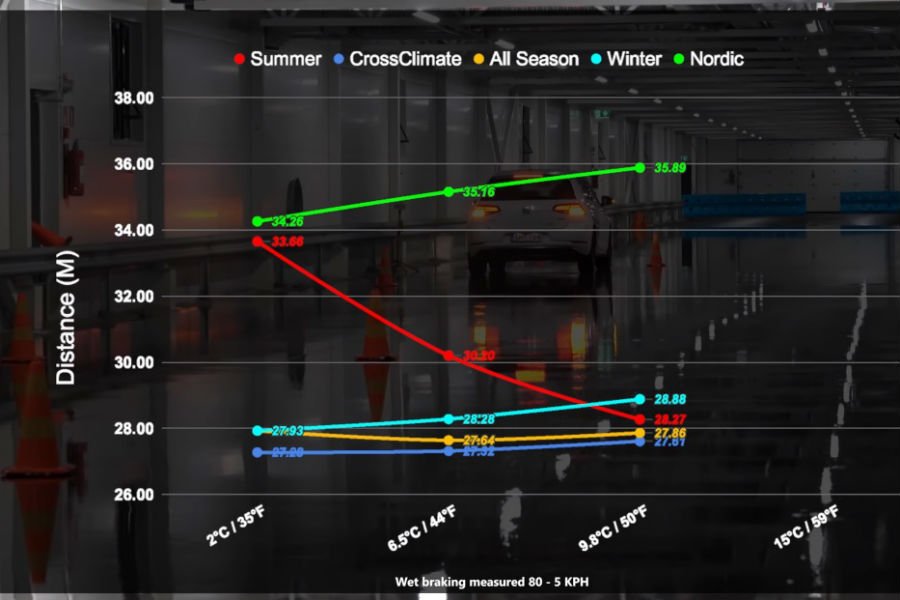 Το Tyre Reviews χρησιμοποίησε εγκαταστάσεις τελευταίας τεχνολογίας, προκειμένου να αναλύσει το πόσο και πώς επηρεάζονται όλων των ειδών τα ελαστικά από τις μεταβολές της θερμοκρασίας – αλλά και, φυσικά, να τα συγκρίνει μεταξύ τους. Αναλόγως κατάστασης της επιφάνειας -στεγνή ή βρεγμένη- παρουσιάζεται η αντίστοιχη διαφοροποίηση υπέρ του ενός ή του άλλου τύπου. Αυτό που έχει ιδιαίτερο ενδιαφέρον, ωστόσο, είναι το πόσο μπορεί να επηρεάσει την απόσταση ακινητοποίησης η θερμοκρασία, ειδικά όταν η άσφαλτος είναι υγρή.