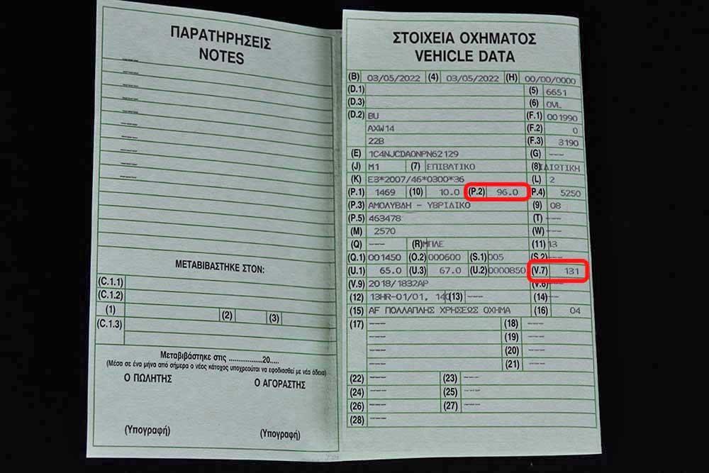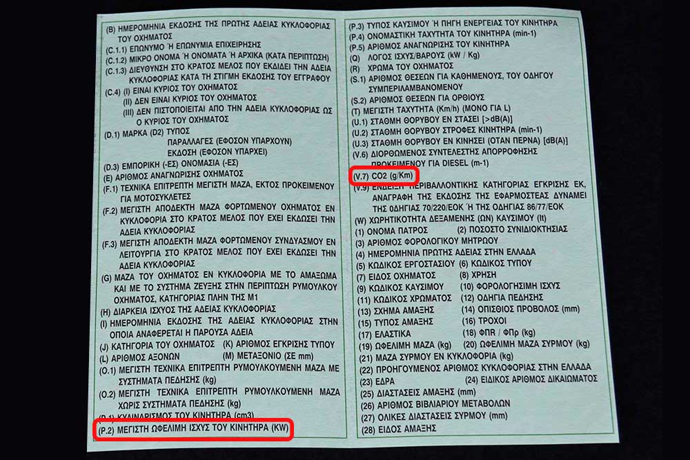 Στην συγκεκριμένη περίπτωση εστιάζουμε στο (P.2) που αφορά το πεδίο Μέγιστη Ωφέλιμη Ισχύς του Κινητήρα, σε KW. Αυτά τα πολλαπλασιάζουμε x1,36 για να έχουμε τους γνωστούς σε όλους ίππους (π.χ. 96 KW x 1,36=130,56 PS). Οι εκπομπές CO2 βρίσκονται στο πεδίο (V.7) CO2 (g/Km). Πιο αναλυτικά στοιχεία μπορείτε να δείτε στις σχετικές εικόνες που παραθέτουμε.