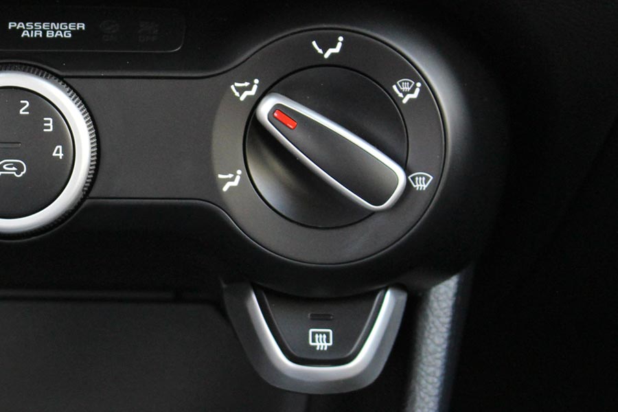 Η ένδειξη στο αριστερό κουμπί βρίσκεται επίσης σε όλα τα αυτοκίνητα και είναι για το ξεθάμπωμα του εμπρός παρμπρίζ. Μόνο που υπάρχει μια διαφορά μεταξύ εκείνων που διαθέτουν ηλεκτρονικό κλιματισμό και το απλό air condition. Στην πρώτη περίπτωση, με το πάτημά του αμέσως ενεργοποιείται ο κλιματισμός και ο αέρας στην υψηλότερη σκάλα κατευθύνεται στο εμπρός παρμπρίζ για να ξεθολώσει. Στο air condition η διαδικασία γίνεται χειροκίνητα και ανάλογα το μοντέλο πρέπει να πατηθεί και το κουμπί του a/c.