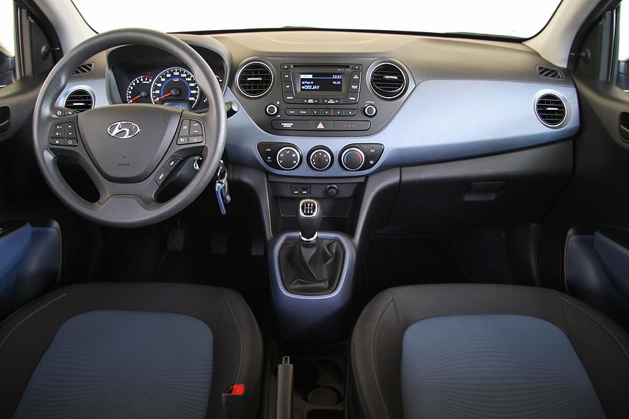 Πλήρως ανανεωμένο με την σειρά του είναι και το εσωτερικό του νέου i10 με την ευχάριστη συνολικά εικόνα και τα νεανικά χαρακτηριστικά. Το διάκοσμο αναβαθμίζει σημαντικά η διχρωμία στο ταμπλό, κονσόλα, πόρτες και καθίσματα (μαύρο – μπλε στο αυτοκίνητο της δοκιμής). Στον τομέα της κατασκευής του εσωτερικού, όλα τα πλαστικά είναι σκληρά και ικανοποιούν με την ποιότητα και την συναρμογή τους, ωστόσο δεν απουσίαζαν μικροτριγμοί από διάφορα σημεία της καμπίνας. Επίσης, στις εμπρός τουλάχιστον πόρτες θα ήταν προτιμότερο να υπήρχε επένδυση υφάσματος ή κάποιο αφρώδες υλικό έστω στο σημείο που ακουμπούν οι αγκώνες. Από πλευράς εργονομίας και θέσης οδήγησης δεν υπάρχει κάποιο παράπονο, όπως και με τις αρκετές θέσεις που υπάρχουν για αποθήκευση διαφόρων μικρών αλλά και μεγαλύτερων αντικειμένων. Τα επιμέρους χειριστήρια είναι εύχρηστα, ο επιλογέας των ταχυτήτων είναι σωστά και βολικά τοποθετημένος ψηλά. Πλήρης και με ευδιάκριτες ενδείξεις είναι ο πίνακας οργάνων με το μεγάλο ταχύμετρο και στροφόμετρο και τις ψηφιακές ενδείξεις του trip computer στο κάτω μέρος. Πολύ ικανοποιητικοί για τα δεδομένα των μίνι αυτοκινήτων είναι και οι διαθέσιμοι χώροι τόσο για τους επιβάτες όσο και για τις αποσκευές, με τα 252 λτ. να το κατατάσσουν μεταξύ των κορυφαίων της κατηγορίας.