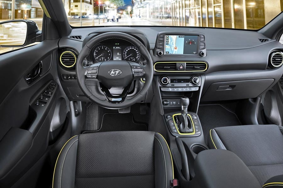 Μοντέρνο είναι και το εσωτερικό του Kona με τις απαλές καμπύλες επιφάνειες. Έμφαση έχει δοθεί στην ποιότητα, την εργονομία, τους χώρους, την πρακτικότητα και την τεχνολογία με την τοποθέτηση της οθόνης αφής 8 ιντσών για το σύστημα πολυμέσων, του Head-Up Display, καθώς και σύστημα ασύρματης φόρτισης.
