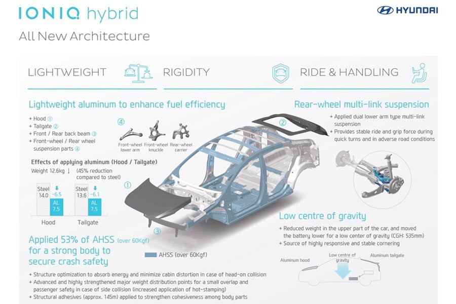 Τις πρώτες αναλυτικές τεχνικές λεπτομέρειες και φωτογραφίες από το αμάξωμα και το εσωτερικό παρουσίασε η Hyundai για το νέο υβριδικό μοντέλο της IONIQ, το οποίο θα διαθέτει πλήρως ηλεκτρική έκδοση, υβριδική, αλλά και υβριδική plug-in (φόρτιση και από πρίζα) και θα είναι το πρώτο αυτοκίνητο της ιστορίας που θα έχει τρεις ηλεκτρικές επιλογές.