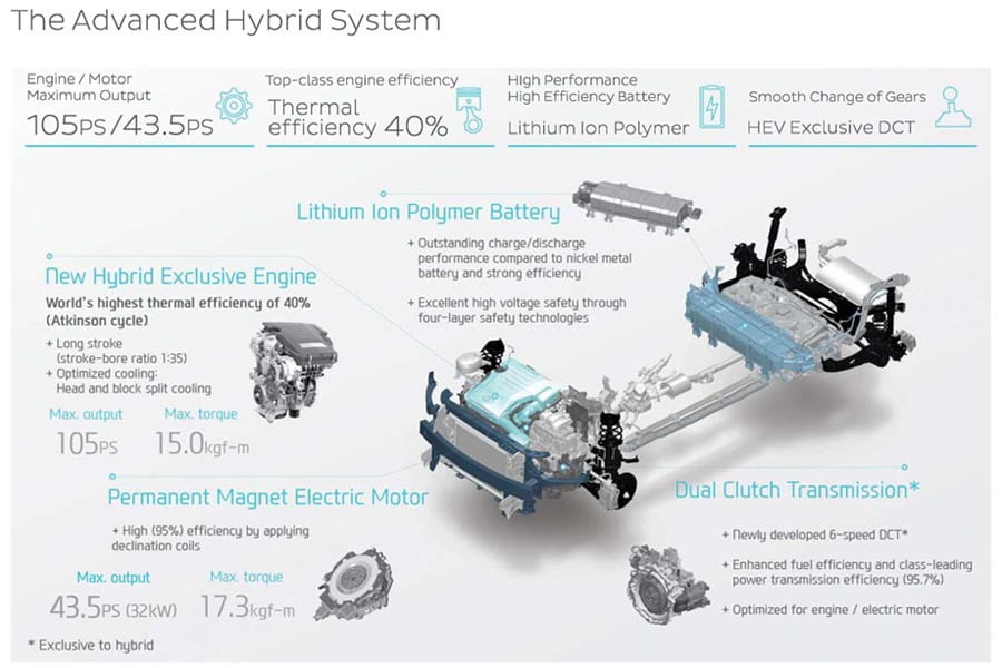 Το υβριδικό σύστημα κίνησης αποτελείται από ένα κινητήρα βενζίνης 1.6 GDi ισχύος 105 ίππων και 147 Nm ροπής και από ένα ηλεκτροκινητήρα απόδοσης 43,5 ίππων και 170 Nm ροπής. Το σύστημα συνδυάζεται με διπλού συμπλέκτη κιβώτιο 6DCT και με μπαταρία Λιθίου Ιόντων Πολυμερούς, η οποία εξασφαλίζει υψηλή απόδοση φόρτισης και εκφόρτισης.