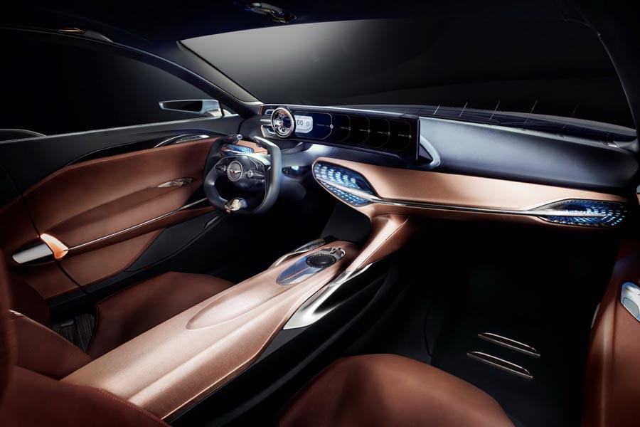 Σπορτίφ και πολυτελές είναι και το εσωτερικό του Genesis New York Concept, όπου κυριαρχούν η μεγάλη οθόνη των 21 ιντσών που ενσωματώνει τον πίνακα οργάνων και το σύστημα infotainment και το τετράγωνο, κομμένο τιμόνι που θυμίζει χειριστήριο αεροσκάφους. Κατά μήκος της καμπίνας εκτείνεται η κεντρική κονσόλα, η οποία χωρίζει τις τέσσερις ανεξάρτητες θέσεις.
