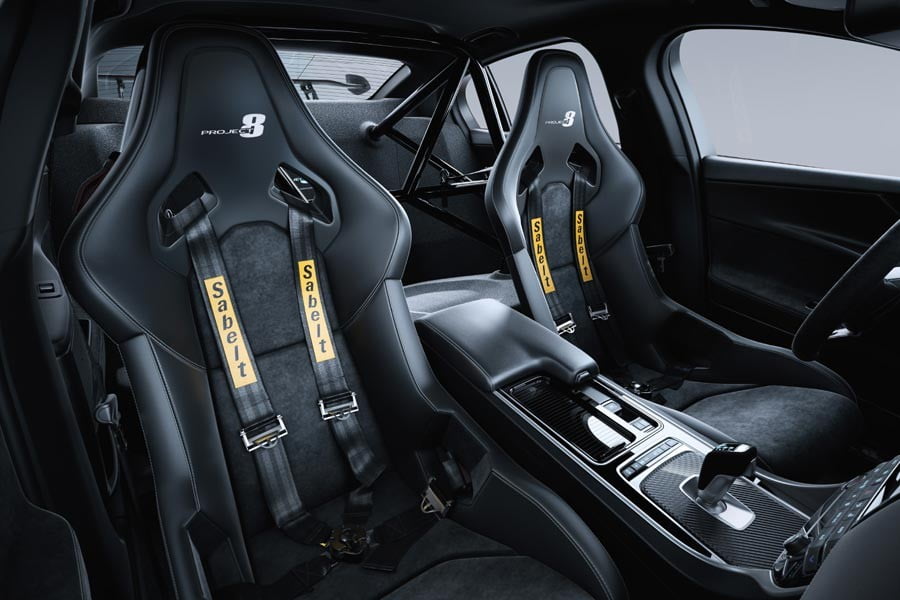 Η σπορ ατμόσφαιρα κυριαρχεί και στο εσωτερικό, εκεί όπου υπάρχουν μπάκετ καθίσματα με δέρματα και αλκαντάρα, σπορ τιμόνι επίσης με αλκαντάρα, καθώς και carbon επενδύσεις. Προαιρετικά, με το ειδικό πακέτο Track Pack, η Jaguar δίνει μια αγωνιστική διαμόρφωση με αποκλειστικά 2 αγωνιστικού τύπου carbon καθίσματα και πίσω roll cage.