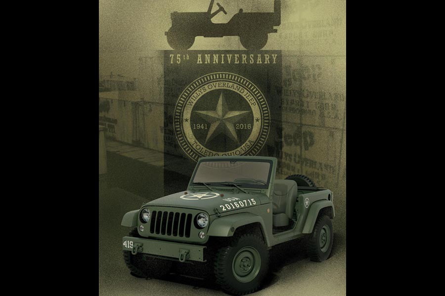 Η Jeep γιορτάζει την 75η επέτειό της με το πρωτότυπο μοντέλο Wrangler 75th Salute, το οποίο αποτίνει φόρο τιμής στο ιστορικό στρατιωτικό όχημα Willys, που είχε γίνει σύμβολο των αμερικανικού στρατού κατά τη διάρκεια του Β.Π.Π.