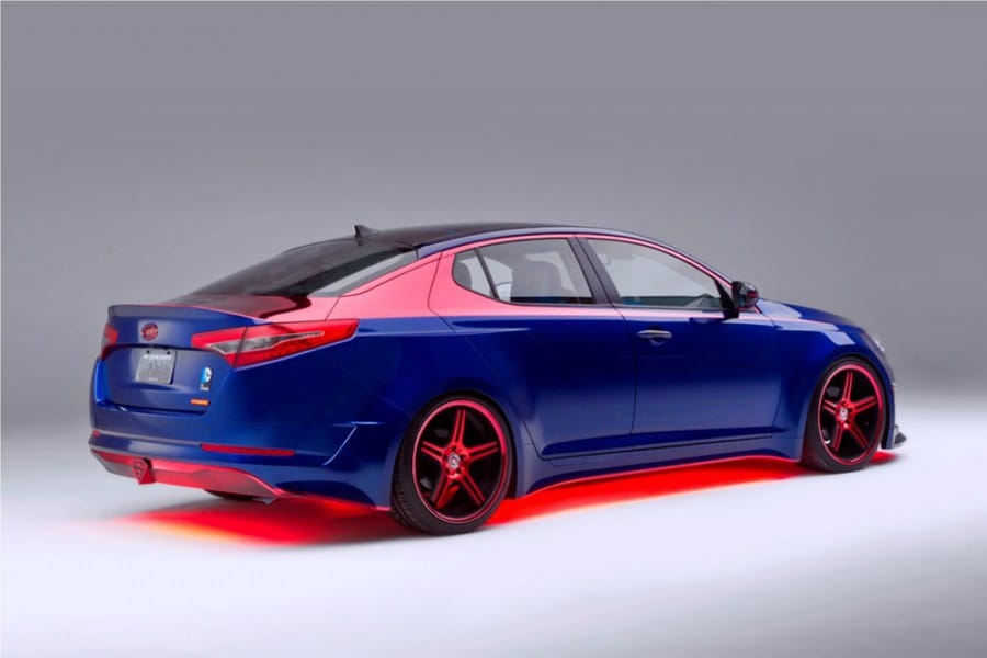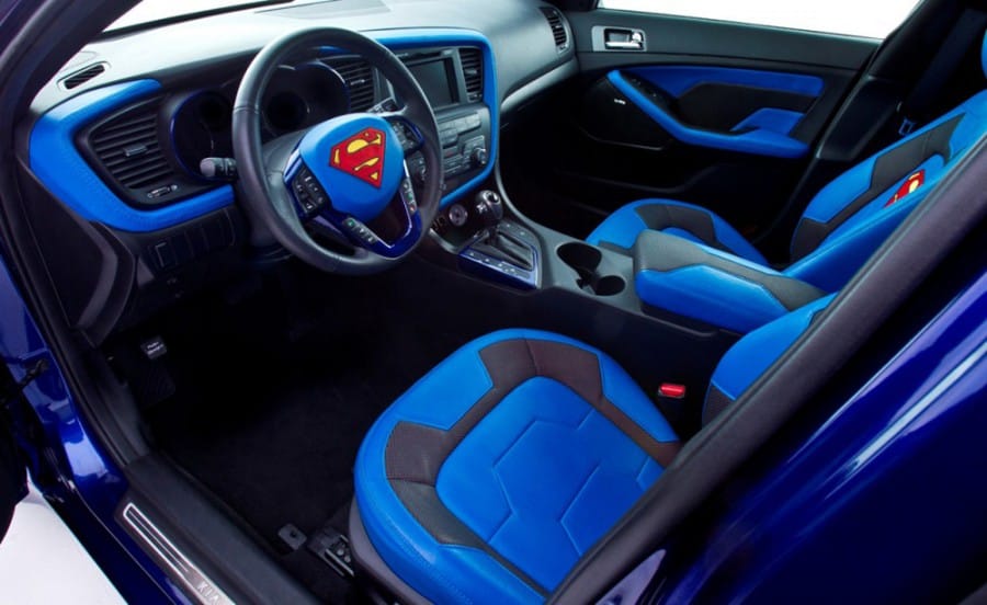 To οικογενειακό μεσαίο σεντάν Kia Optima Hybrid άλλαξε διαθέσεις και φόρεσε την… στολή του superman. Έτσι ντύθηκε στα χρώματα του δημοφιλούς σούπερ ήρωα, όπως είναι το μπλε ηλεκτρίκ που αποτελεί το κυρίαρχο χρώμα του αμαξώματός του συνδυασμένο με κόκκινης απόχρωσης ζάντες, μάσκα και ορισμένες ακόμα εξωτερικές επιφάνειες. Χαρακτηριστικά του αισθητικά στοιχεία αποτελούν ακόμα ο κόκκινος φωτισμός neon στο δάπεδο του αυτοκινήτου και φυσικά το σήμα του σούπερμαν στο καπό του Optima Hybrid.