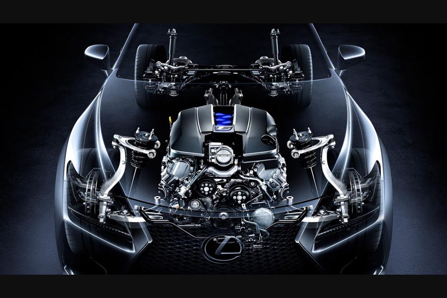 Για την κίνηση του νέου Lexus RC F φροντίζει το V8 5.0 λτ. Dual VVT-i μηχανικό σύνολο απόδοσης 477 ίππων και 530 Nm ροπής, το οποίο συνδυάζεται με 8 σχέσεων αυτόματο κιβώτιο. Ο εν λόγω κινητήρας επιταχύνει το βάρους 1.765 κιλών αμάξωμα στο 0-100 χλμ./ώρα σε 4,5 δλ., στα 80-120 χλμ./ώρα σε 3,7 δλ., διανύει τα 0-400 μ. σε 12,5 δλ. και η τελική ταχύτητα φτάνει τα 270 χλμ./ώρα. Όσο για την κατανάλωση και τις εκπομπές CO2 ανέρχονται στα 10,8 λτ./100 χλμ. και 252 γρ./χλμ. αντίστοιχα.