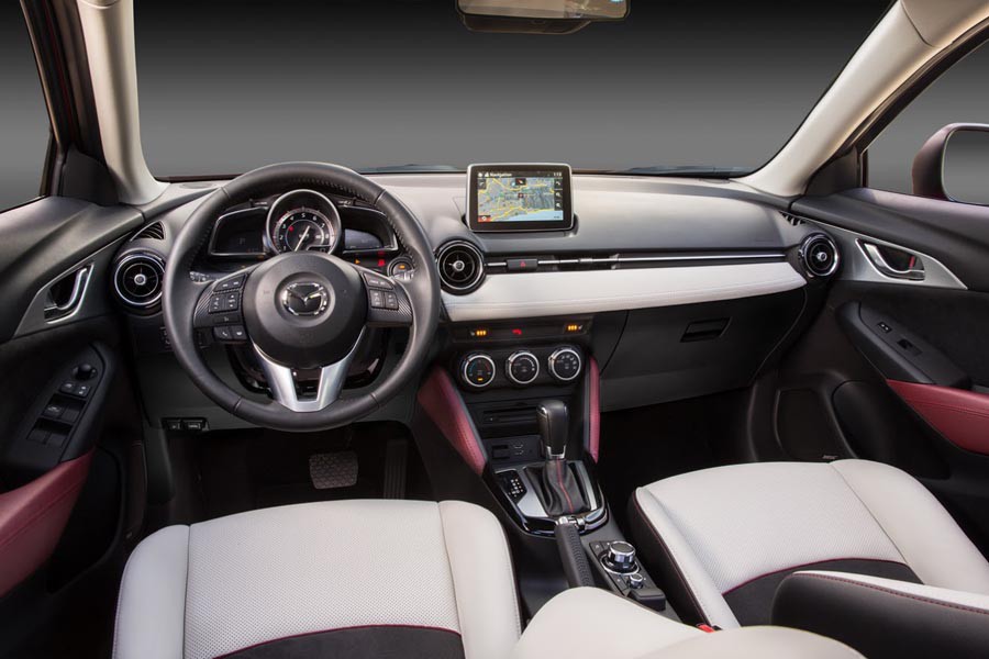 Από το νέο Mazda2 προέρχεται και το εσωτερικό του CX-3, το οποίο ξεχωρίζει για τη μινιμάλ σχεδίασή του με σπορτίφ στοιχεία, το μοντέρνο πίνακα οργάνων, τη μεγάλη οθόνη του συστήματος infotainment στο κέντρο του ταμπλό και τους στρογγυλούς αεραγωγούς. Επίσης, οι χώροι φαίνονται άνετοι (από την φωτογραφία) τόσο για τους εμπρός όσο και για τους πίσω επιβάτες.