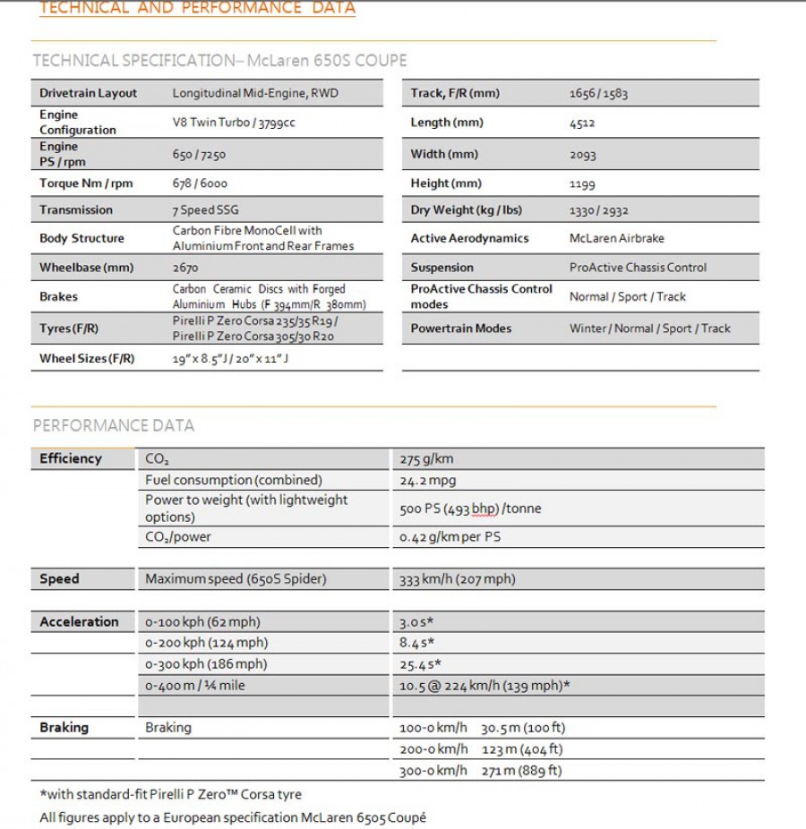 Το νέο δημιούργημα της McLaren, η 650S, η οποία βασίζεται στη 12C αλλά φέρει πολλές αισθητικές αλλαγές και τεχνικές αναβαθμίσεις είναι ταχύτατη, όπως αποδεικνύεται και από τις επιδόσεις που ανακοίνωσε ο εν λόγω κατασκευαστής, ενώ είναι πιο γρήγορη και από την εικονική McLaren F1. Πιο αναλυτικά, τα πρώτα 100 χλμ./ώρα από στάση έρχονται σε μόλις 3,0 δευτερόλεπτα (έναντι 3,1 δλ. της F1), τα 0-200 χλμ./ώρα έρχονται σε 8,45 δλ. και τα 0-300 χλμ. επιτυγχάνονται σε 25,4 δλ. Παράλληλα, η τελική ταχύτητα φτάνει τα 333 χλμ./ώρα, ενώ η κατανάλωση ανέρχεται στα 11,7 λτ./100 χλμ. και οι εκπομπές CO2 στα 275 γρ./χλμ. Την κίνηση της νέας McLaren 650S φροντίζει ο V8 Twin Turbo των 3.8 λίτρων απόδοσης 650 ίππων και 678 Nm ροπής, συνδυασμένος με 7τάχυτο κιβώτιο.