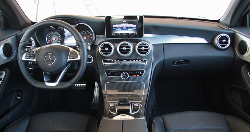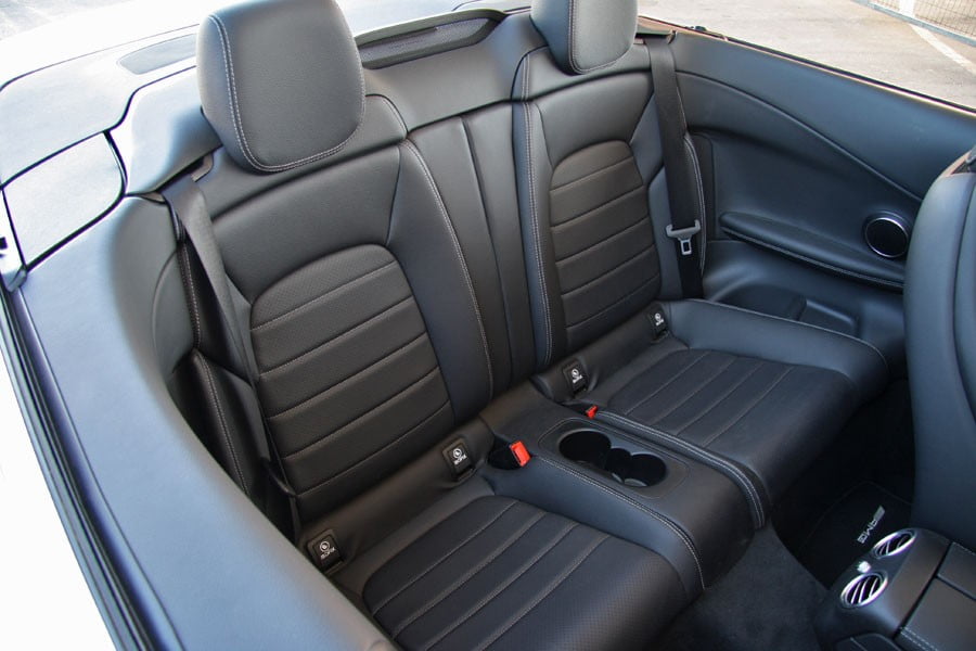 Το εσωτερικό της νέας Mercedes C-Class Cabrio προέρχεται από αυτό της C-Class Coupe, με μοναδική διαφορά την ύπαρξη των διακοπτών για την οροφή, το ταυτόχρονο χειρισμό των τεσσάρων παραθύρων και το σύστημα AIRCAP, στο κέντρο της κονσόλας. Παράλληλα, ειδικά για την C-Class Cabrio η Mercedes έχει τοποθετήσει στα προσκέφαλα των εμπρόσθιων καθισμάτων το σύστημα AIRSCARF (προαιρετικό), που στέλνει ζεστό αέρα στον αυχένα του οδηγού-συνοδηγού, για να τους επιτρέψει να ανοίξουν την οροφή σε πιο… δροσερές εξωτερικές θερμοκρασίες. Σχεδιαστικά, οι γραμμές είναι πολύ μοντέρνες και η εργονομία στα γνωστά πολύ καλά πλαίσια της Mercedes, ενώ η πολυτέλεια τονίζεται μέσω της χρήσης πολύ καλής ποιότητας υλικών στο μεγαλύτερο μέρος της καμπίνας. Οι χώροι στο πίσω κάθισμα είναι επαρκείς για τη μεταφορά δύο ακόμη επιβατών, ενώ το πορτ-μπαγκάζ έχει μειωμένη χωρητικότητα λόγω της αποθήκευσης της οροφής και του μηχανισμού ανοίγματος-κλεισίματός της (285 λίτρα όταν είναι ανοιχτή, 360 λίτρα όταν είναι κλειστή) και μικρό άνοιγμα.